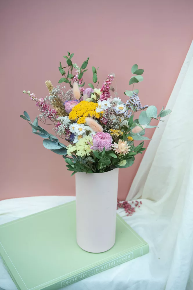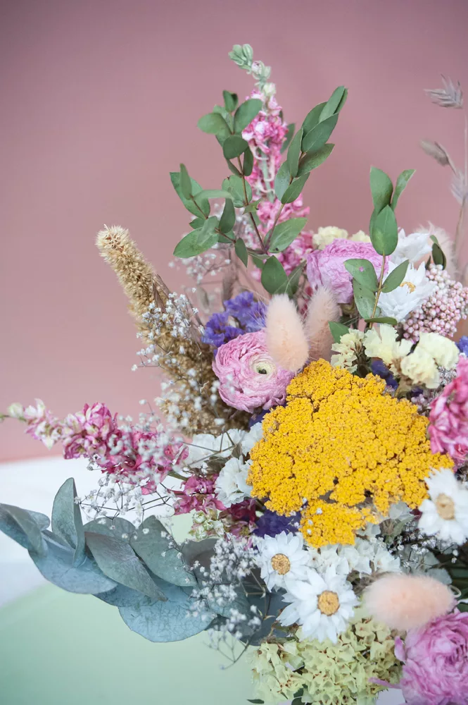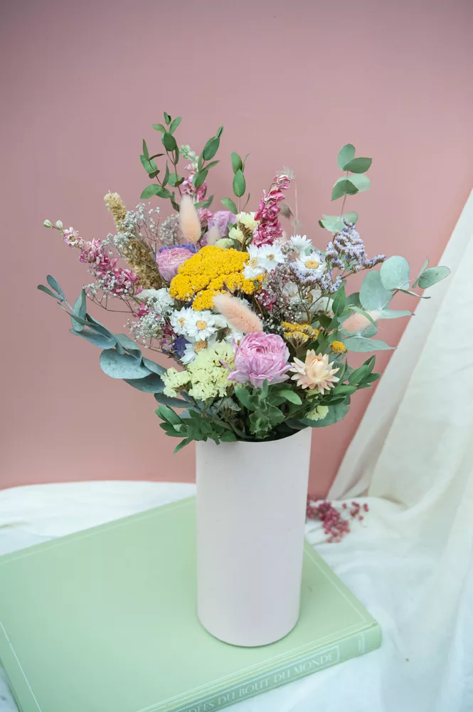Les avantages des fleurs séchées : Un bouquet qui dure plusieurs mois, voire plusieurs années ! Fini les bouquets qui fanent au bout d’une semaine ! Vous investissez dans une décoration durable et responsable. En effet, entre 60 % et 80 % des fleurs proviennent de producteurs français, dans le respect du mouvement Slow Flower.