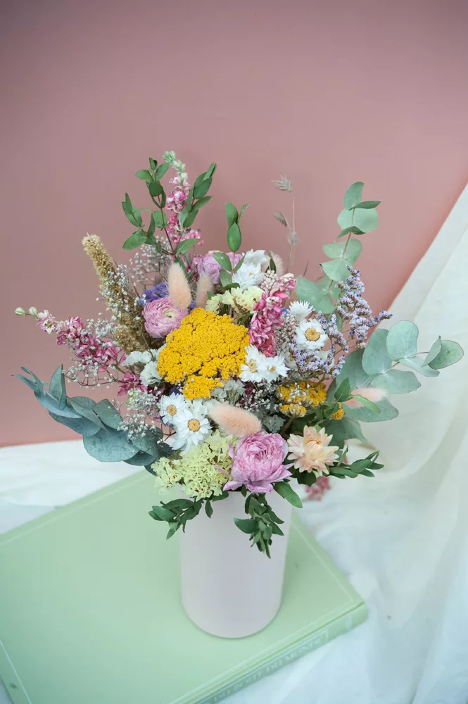 Un doux mélange de textures et de couleurs : Ce bouquet est composé d’un assortiment harmonieux en fleurs séchées et feuillage.