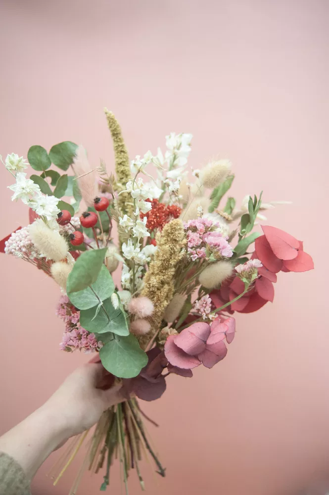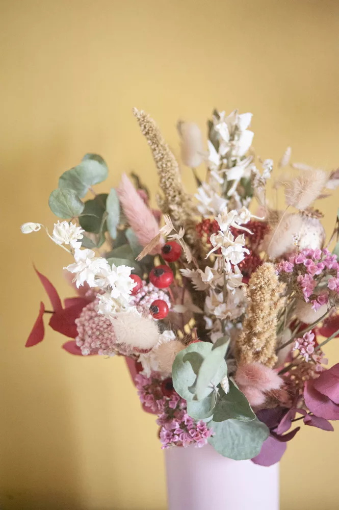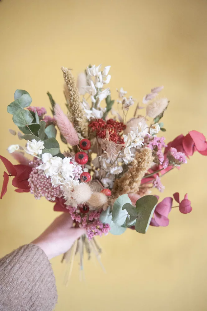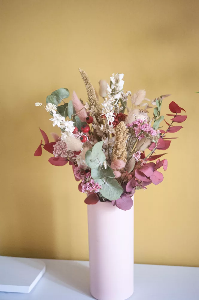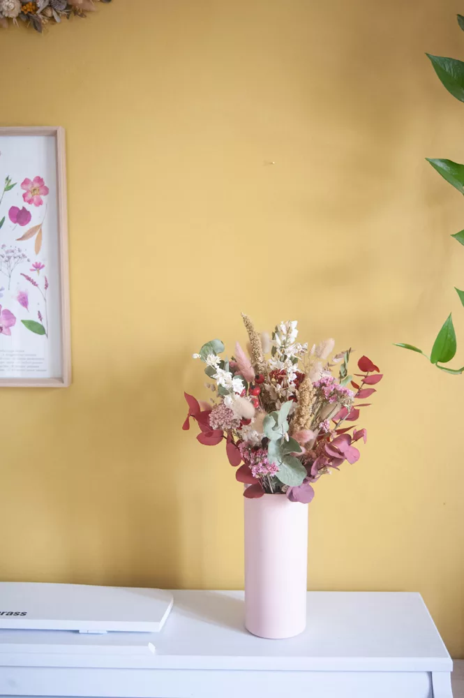 Les avantages des fleurs séchées : Un bouquet qui dure plusieurs mois, voire plusieurs années ! Fini les bouquets qui fanent au bout d’une semaine ! Vous investissez dans une décoration durable et responsable. En effet, entre 50 % et 80 % des fleurs proviennent de producteurs français, dans le respect du mouvement Slow Flower.