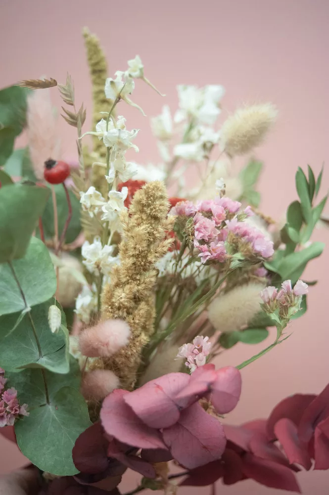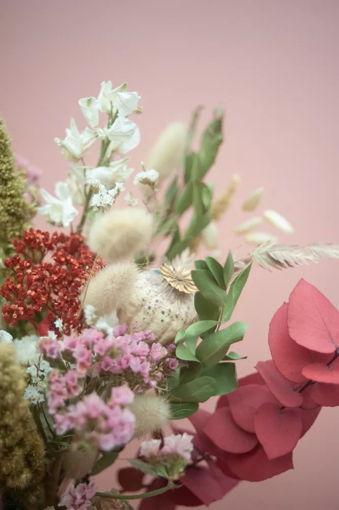 Un doux mélange de textures et de couleurs : Ce bouquet est composé d’un assortiment harmonieux en fleurs séchées et feuillages stabilisées.