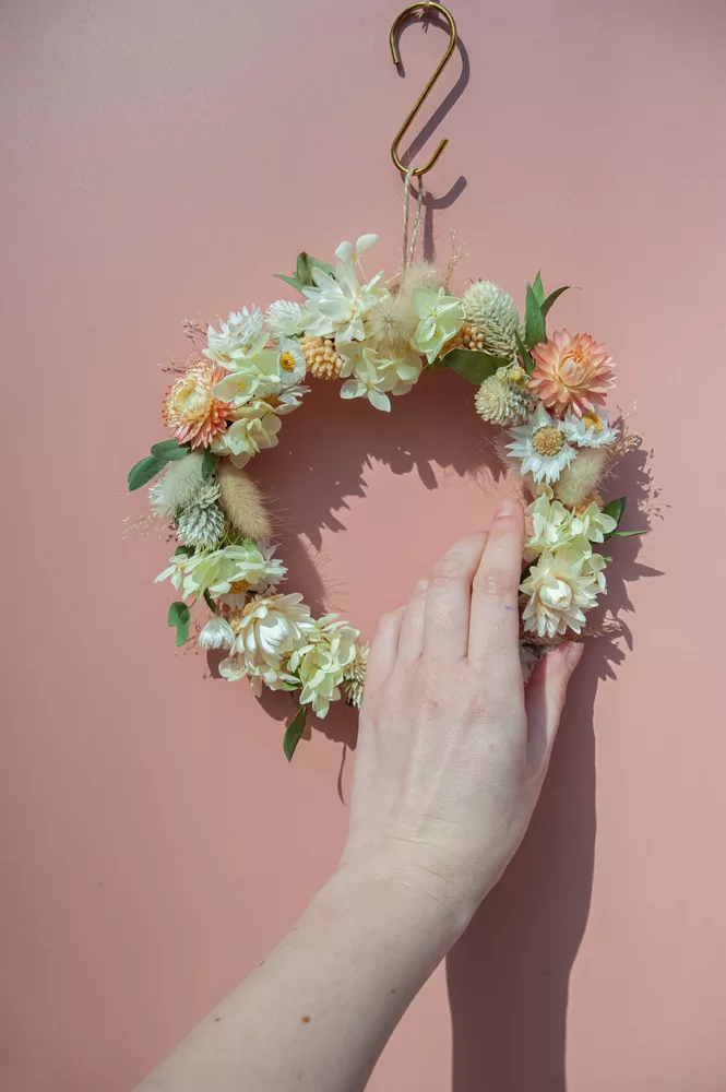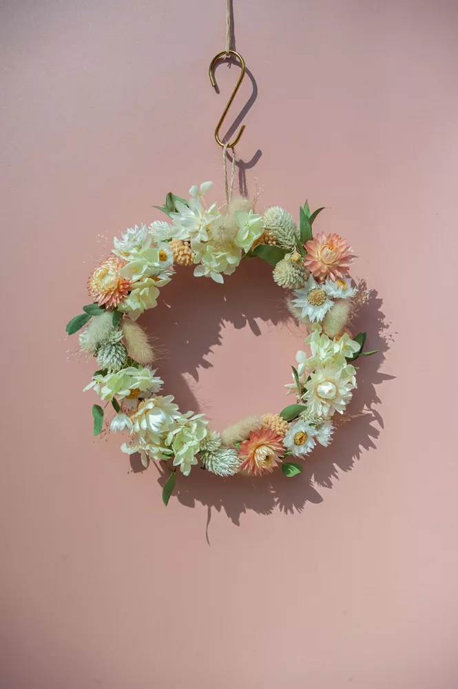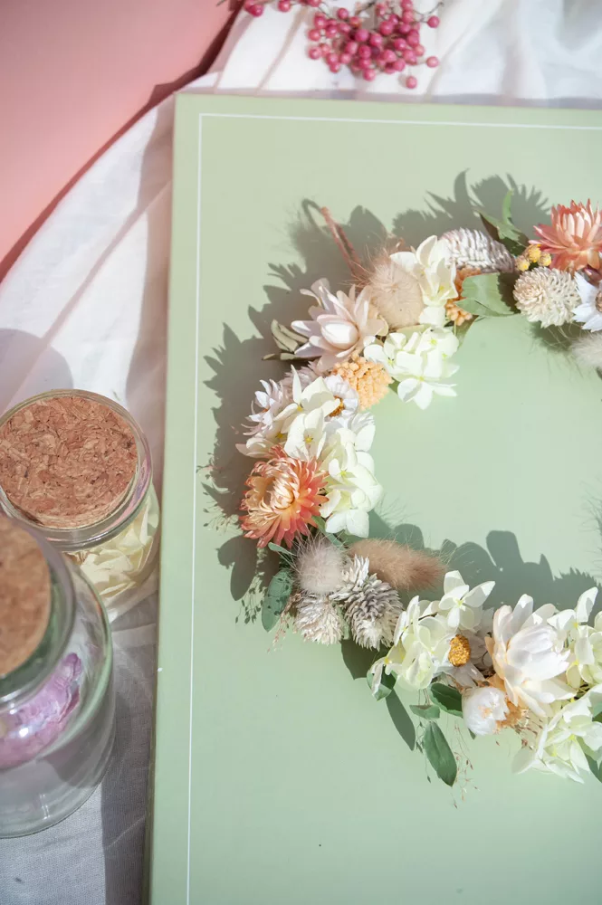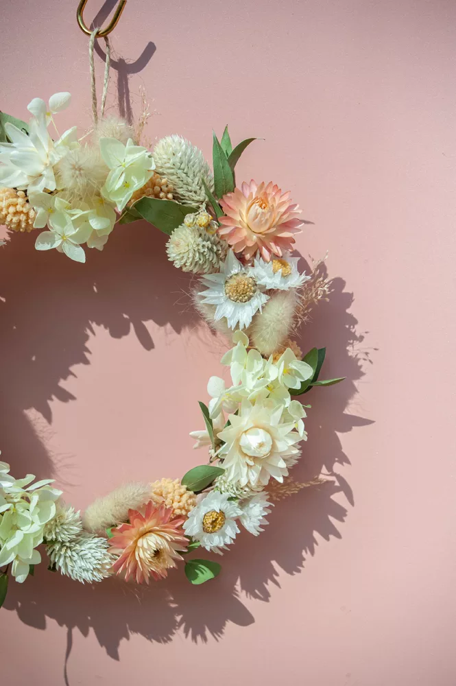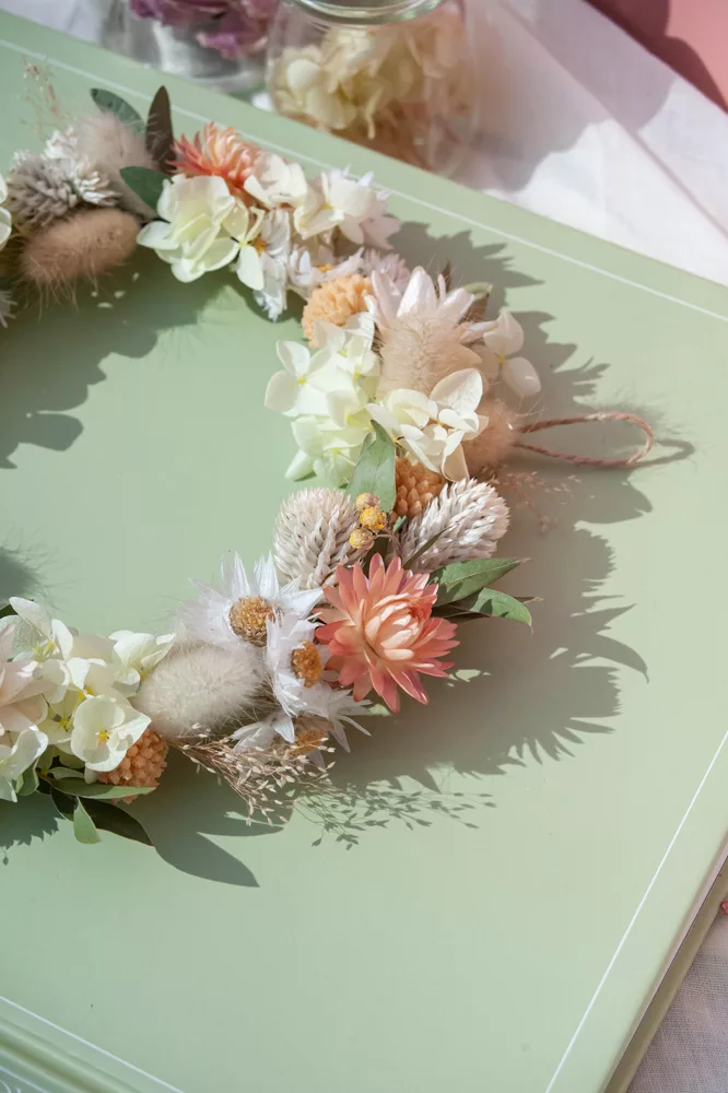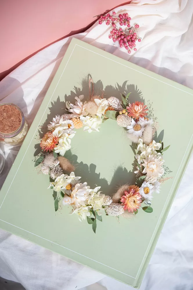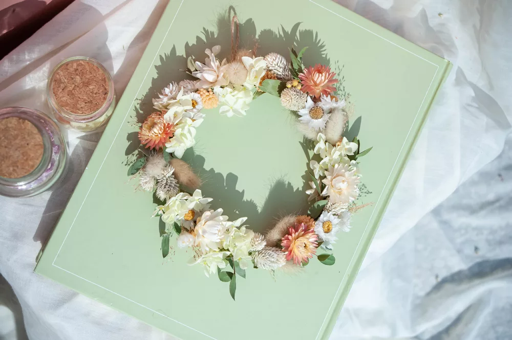 Les avantages des fleurs séchées : Fini les bouquets qui fanent en quelques jours ! Les couronnes en fleurs séchées durent plusieurs mois, voire plusieurs années. Une alternative durable à la fleur fraîche, qui vous permet de profiter longtemps de la beauté florale sans gaspillage.
