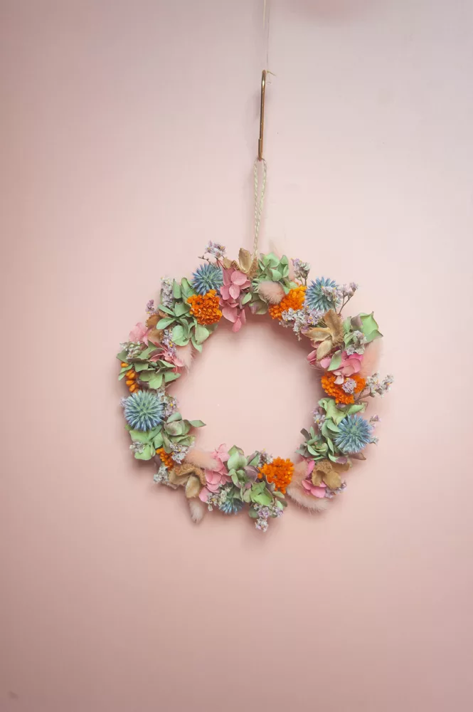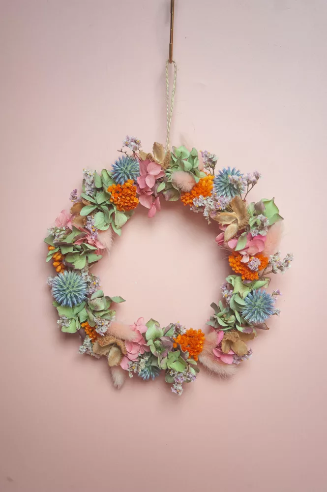 Cette couronne est composée d’un mélange de fleurs séchées et stabilisées colorées.
