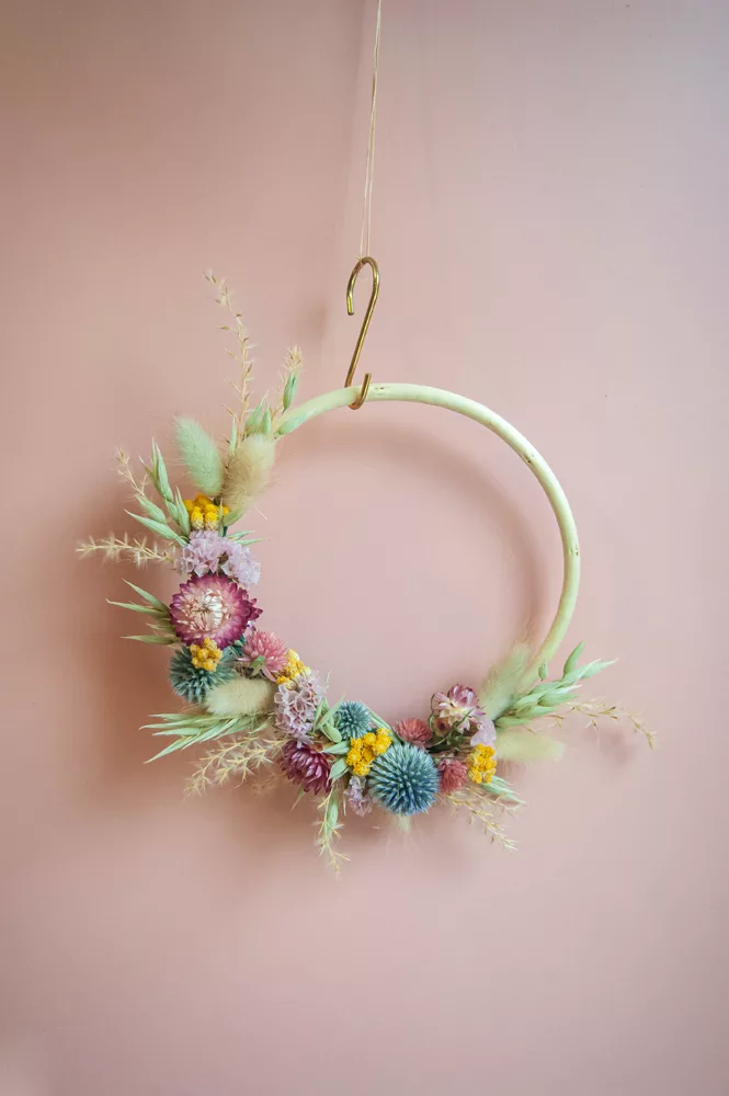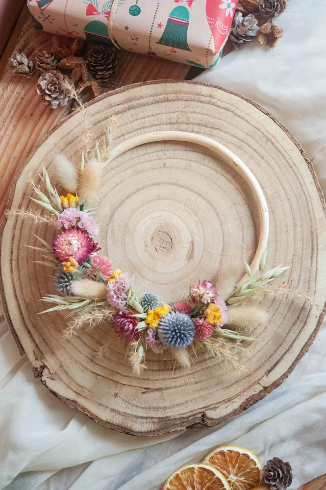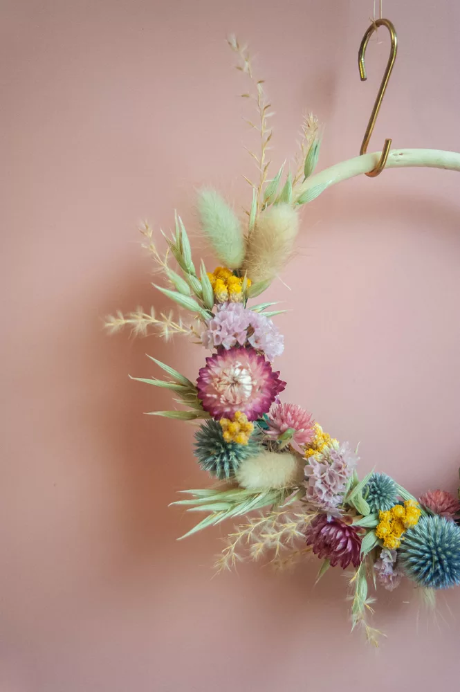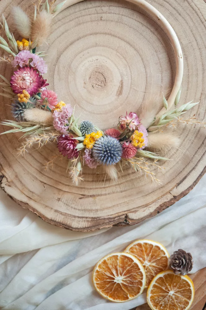 Les avantages des fleurs séchées : Fini les bouquets qui fanent en quelques jours ! Les couronnes en fleurs séchées durent plusieurs mois, voire plusieurs années. Une alternative durable à la fleur fraîche, qui vous permet de profiter longtemps de la beauté florale sans gaspillage.
