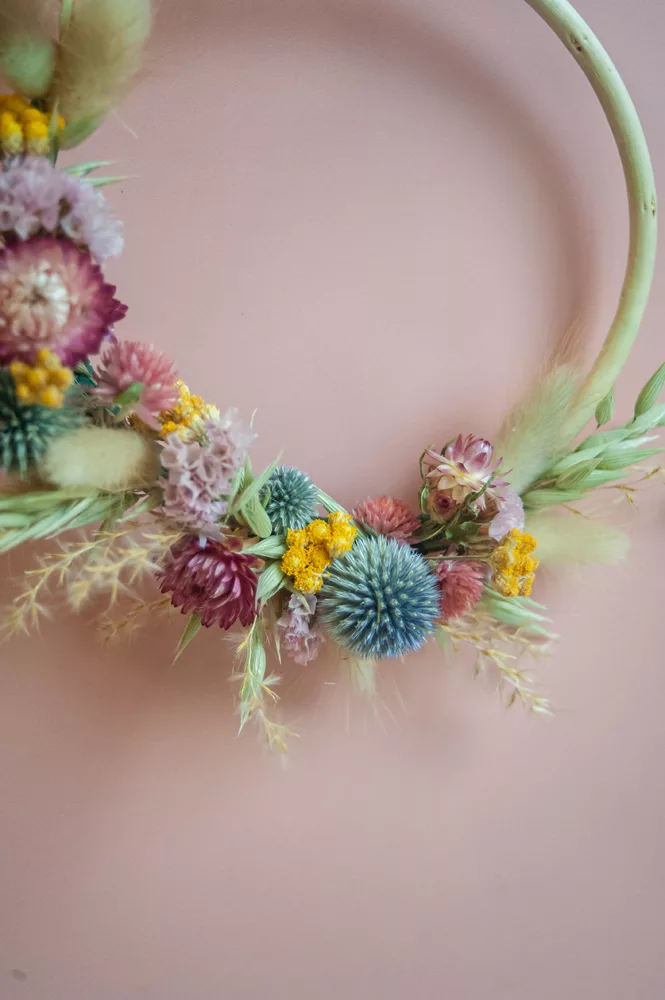 Cette couronne est composée d’un délicat mélange 100% de fleurs séchées venant de chez mon producteur partenaire Terralya.
