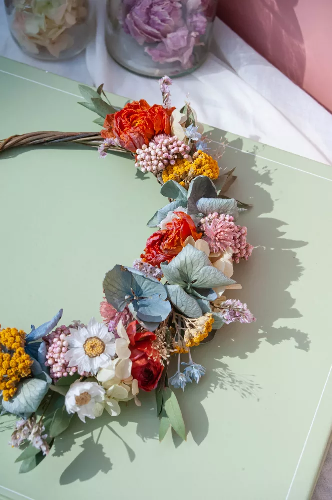 – Couronne artisanale en fleurs séchées et stabilisées.