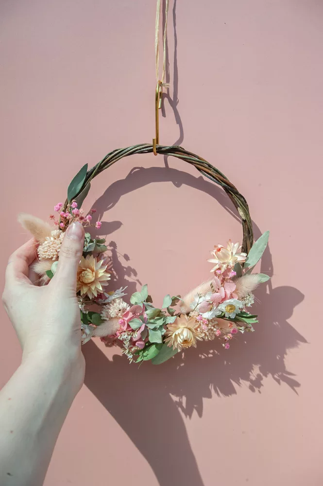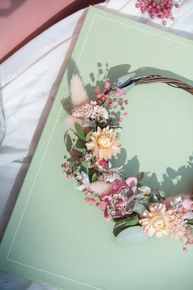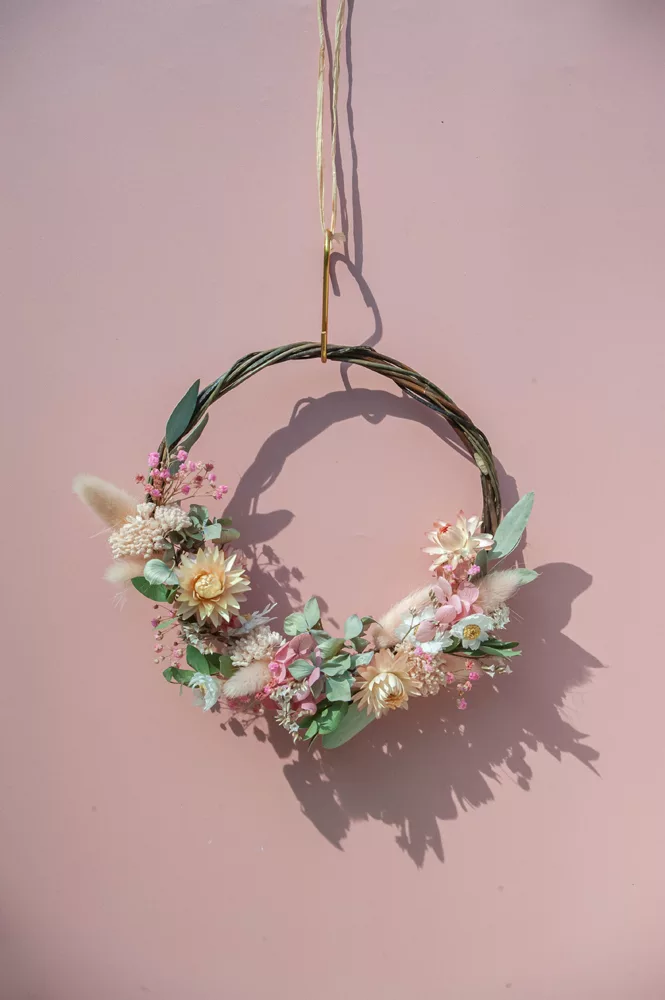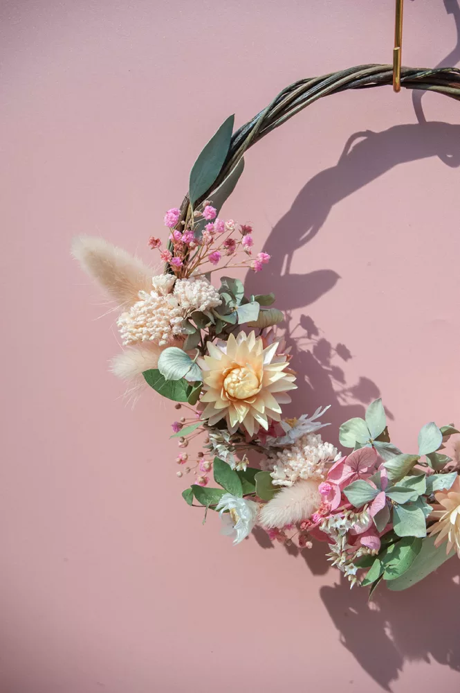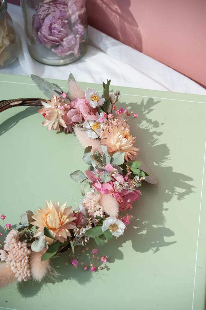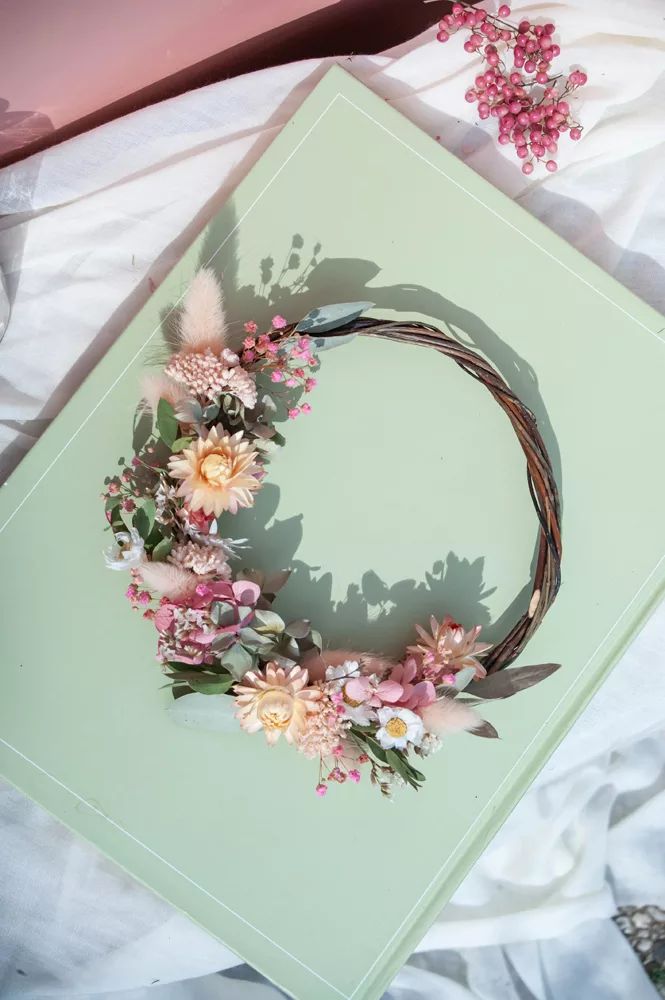 Les avantages des fleurs séchées : Fini les bouquets qui fanent en quelques jours ! Les couronnes en fleurs séchées durent plusieurs mois, voire plusieurs années. Une alternative durable à la fleur fraîche, qui vous permet de profiter longtemps de la beauté florale sans gaspillage.
