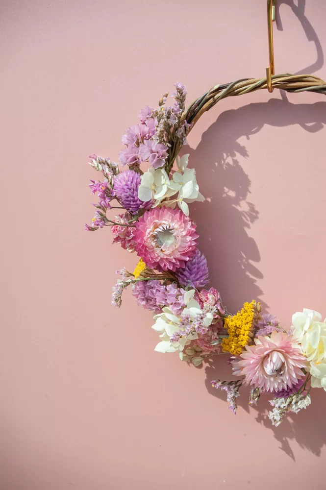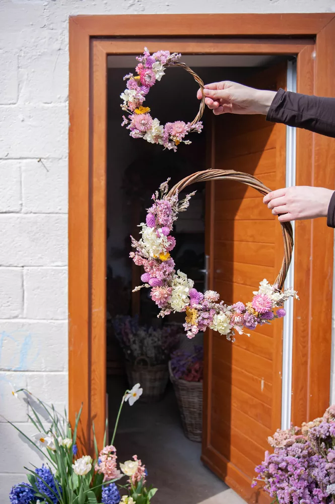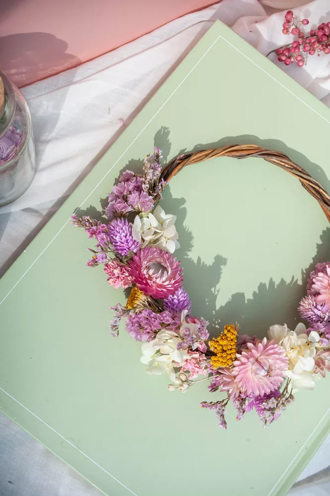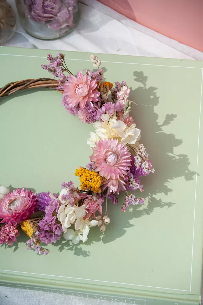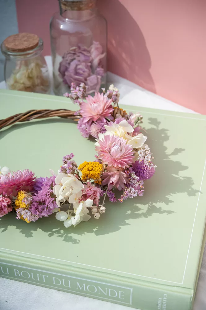 Les avantages des fleurs séchées : Fini les bouquets qui fanent en quelques jours ! Les couronnes en fleurs séchées durent plusieurs mois, voire plusieurs années. Une alternative durable à la fleur fraîche, qui vous permet de profiter longtemps de la beauté florale sans gaspillage.