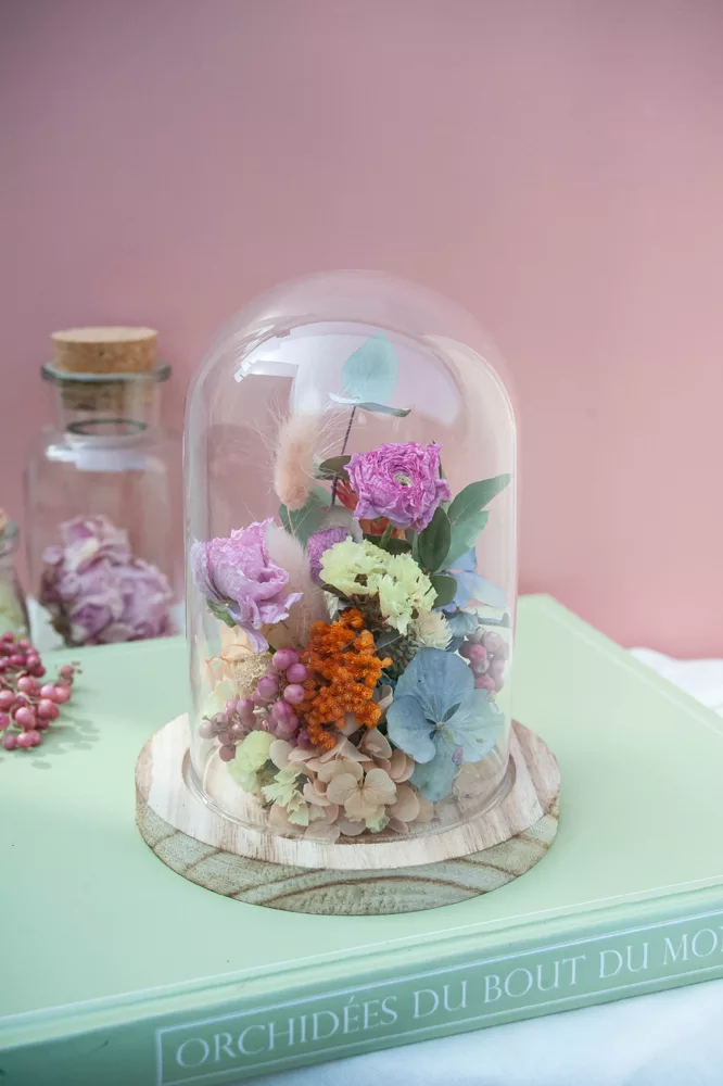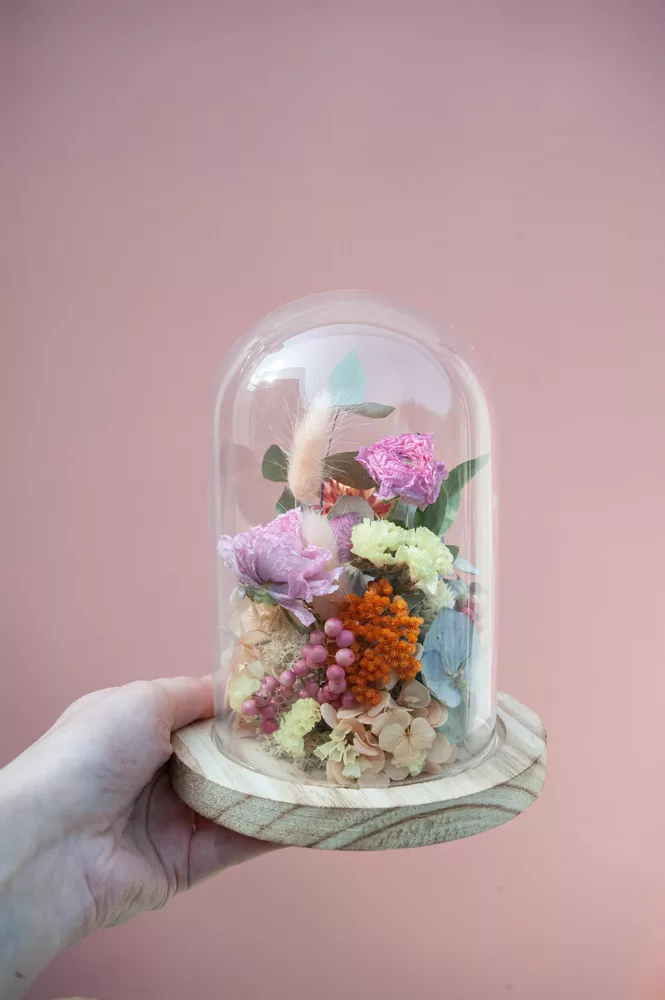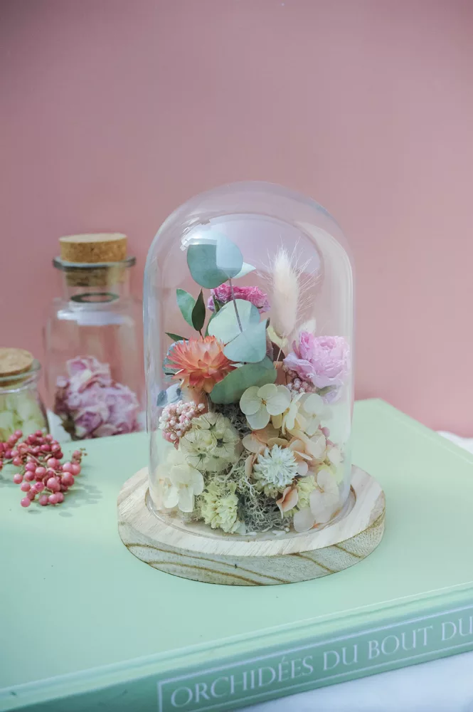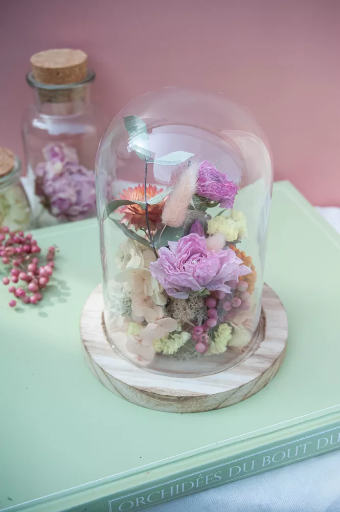 Réalisée à la main avec des fleurs séchées et/ou stabilisées, chaque cloche est composée sans mousse florale (#nofloralfoam), dans une démarche plus respectueuse de l’environnement. La cloche en verre n’est pas scellée : vous pouvez la laisser ouverte ou fermée selon vos envies.