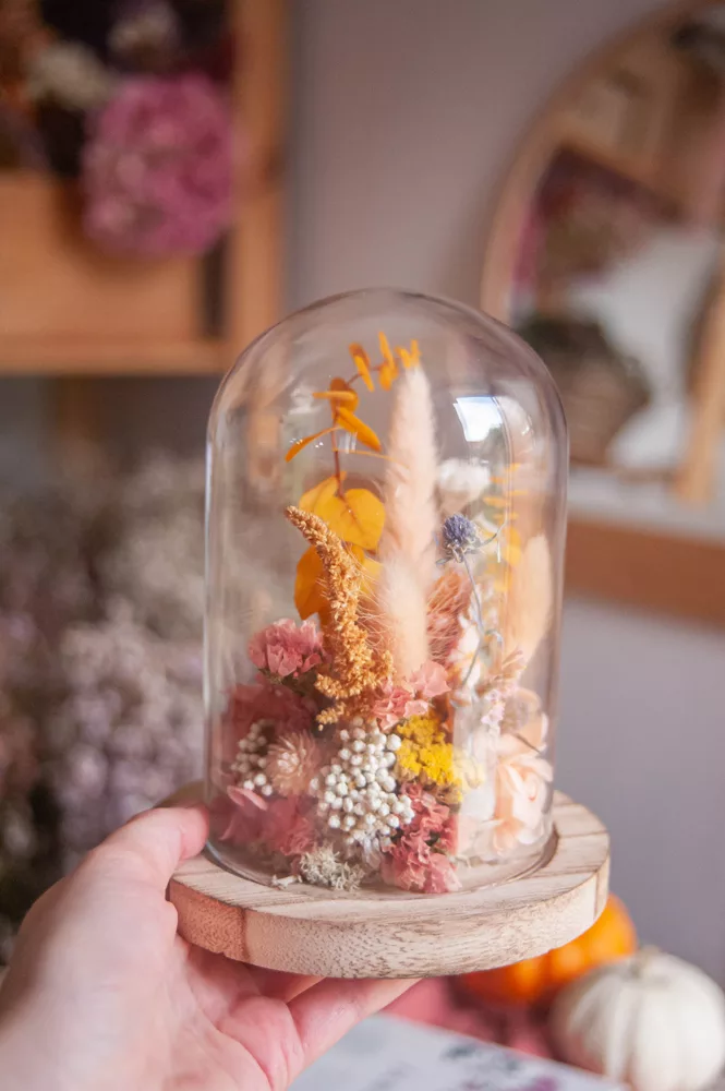 Les fleurs séchées ou stabilisées ne périssent pas et durent plusieurs années. Cependant il est possible que leurs couleurs évoluent avec les années. Pour cela, je vous préconise d’éviter les endroits exposés en plein soleil et les endroits humides. Cette cloche fleurie est réalisée sans mousse florale (mousse à piquer verte) #Nofloralfoam, elle est donc plus écoresponsable ! Toutes mes créations sont réalisées dans mon atelier avec beaucoup de minutie et d’amour. Elles sont entièrement artisanales, c’est pour cela que chaque pièce est unique.