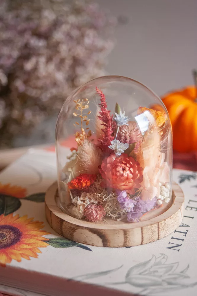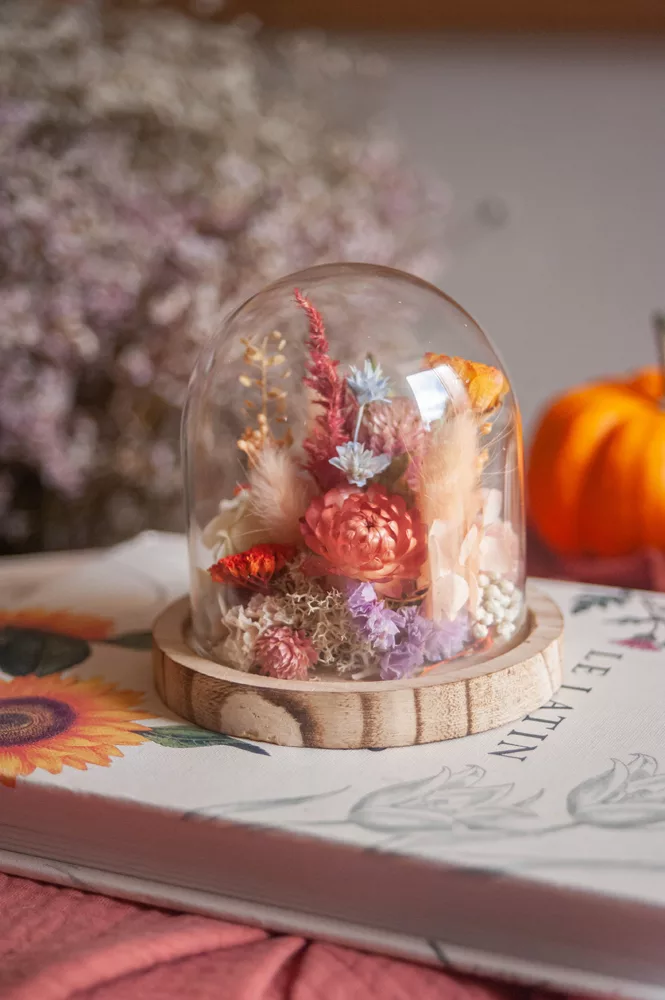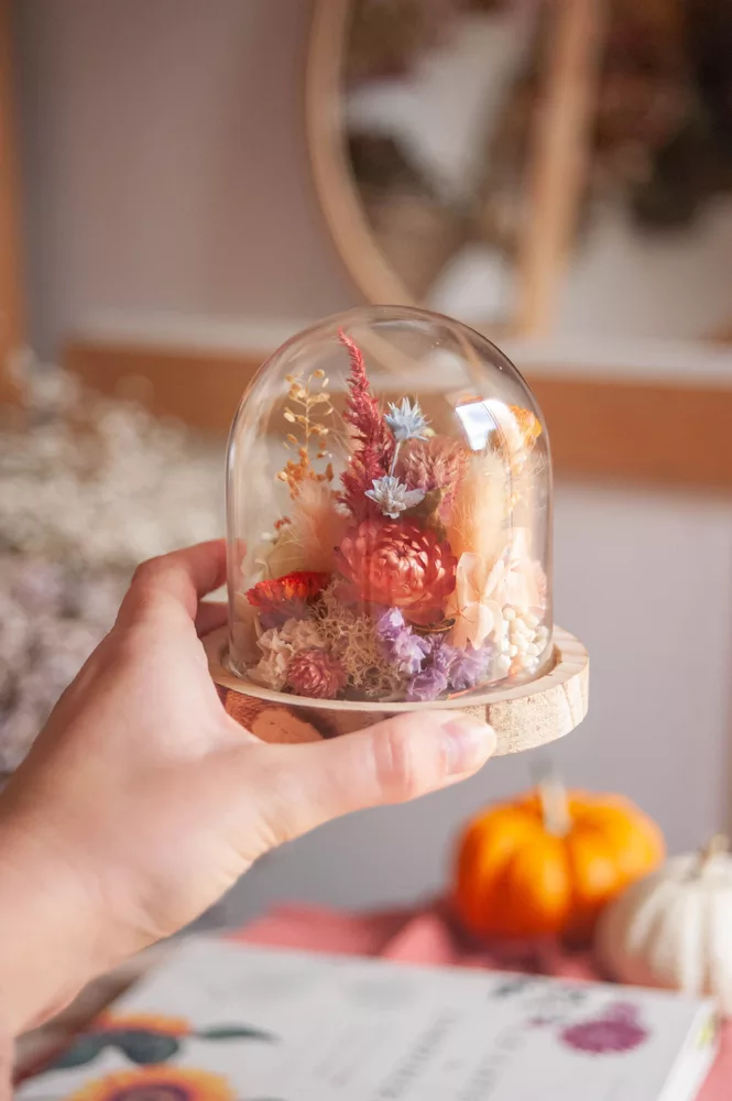 Les fleurs séchées ou stabilisées ne périssent pas et durent plusieurs années. Cependant il est possible que leurs couleurs évoluent avec les années. Pour cela, je vous préconise d’éviter les endroits exposés en plein soleil et les endroits humides. Cette cloche fleurie est réalisée sans mousse florale (mousse à piquer verte) #Nofloralfoam, elle est donc plus écoresponsable ! Toutes mes créations sont réalisées dans mon atelier avec beaucoup de minutie et d’amour. Elles sont entièrement artisanales, c’est pour cela que chaque pièce est unique.