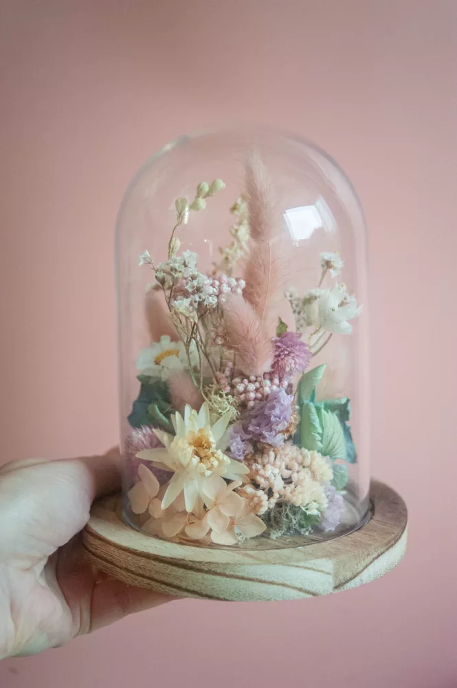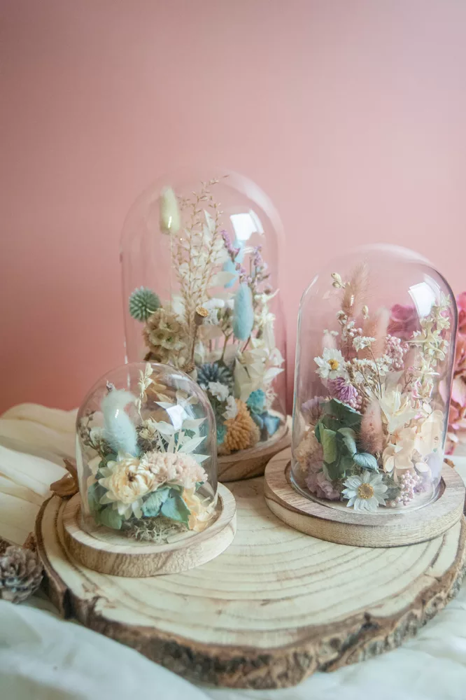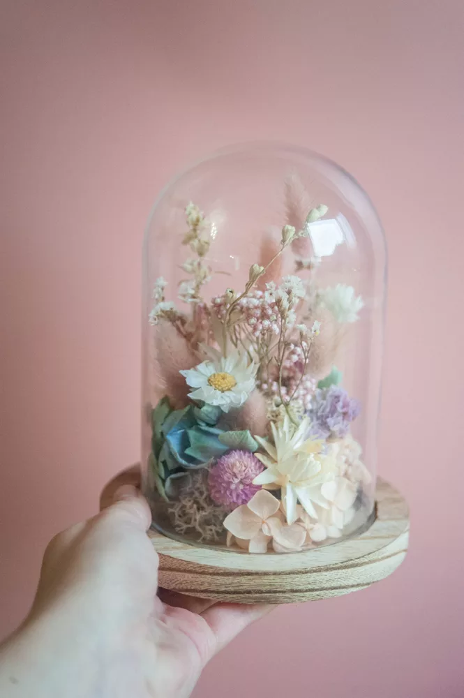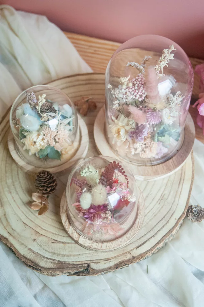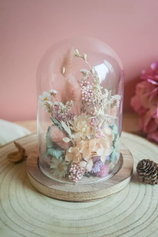 Les fleurs séchées ou stabilisées ne périssent pas et durent plusieurs années. Cependant il est possible que leurs couleurs évoluent avec les années. Pour cela, je vous préconise d’éviter les endroits exposés en plein soleil et les endroits humides. Cette cloche fleurie est réalisée sans mousse florale (mousse à piquer verte) #Nofloralfoam, elle est donc plus écoresponsable ! Toutes mes créations sont réalisées dans mon atelier avec beaucoup de minutie et d’amour. Elles sont entièrement artisanales, c’est pour cela que chaque pièce est unique.