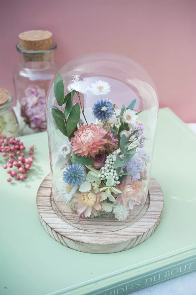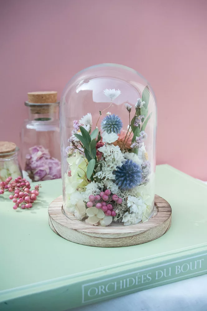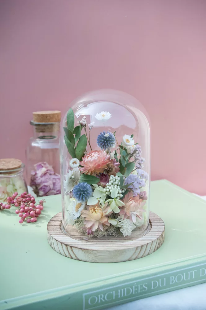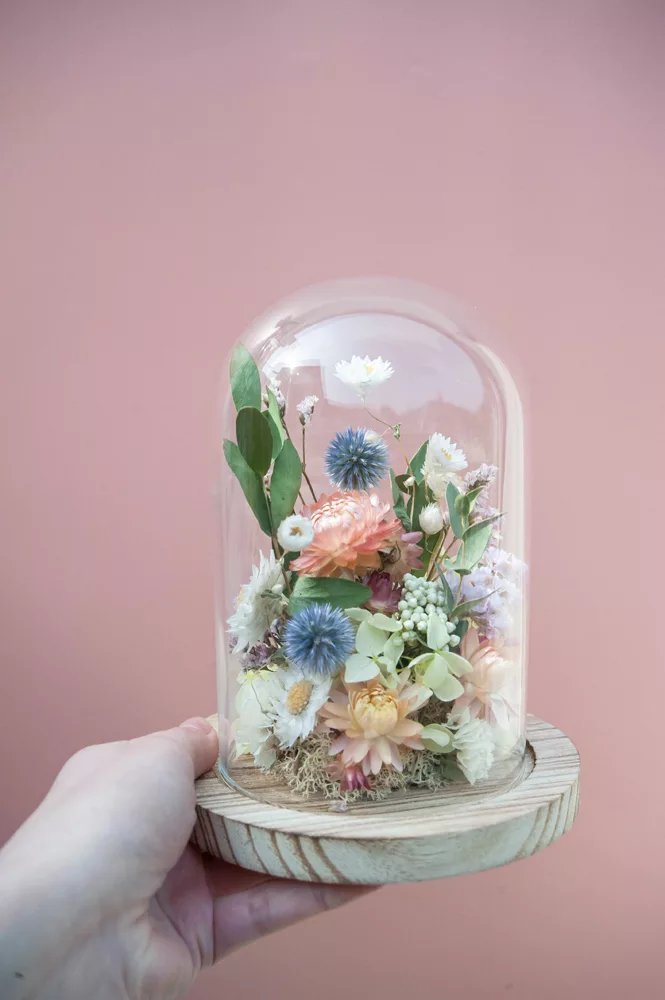 Réalisée à la main avec des fleurs séchées et/ou stabilisées, chaque cloche est composée sans mousse florale (#nofloralfoam), dans une démarche plus respectueuse de l’environnement. La cloche en verre n’est pas scellée : vous pouvez la laisser ouverte ou fermée selon vos envies.