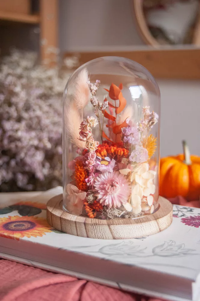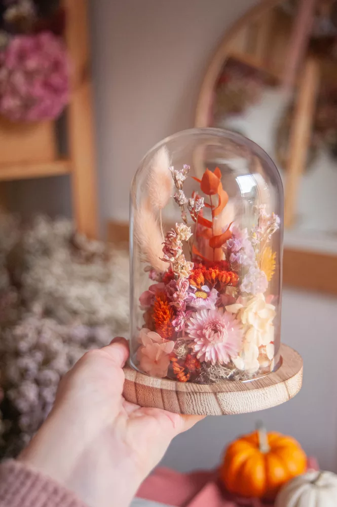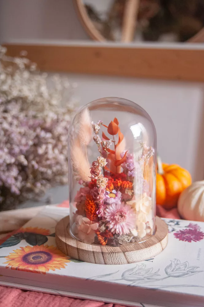 Les fleurs séchées ou stabilisées ne périssent pas et durent plusieurs années. Cependant il est possible que leurs couleurs évoluent avec les années. Pour cela, je vous préconise d’éviter les endroits exposés en plein soleil et les endroits humides. Cette cloche fleurie est réalisée sans mousse florale (mousse à piquer verte) #Nofloralfoam, elle est donc plus écoresponsable ! Toutes mes créations sont réalisées dans mon atelier avec beaucoup de minutie et d’amour. Elles sont entièrement artisanales, c’est pour cela que chaque pièce est unique.