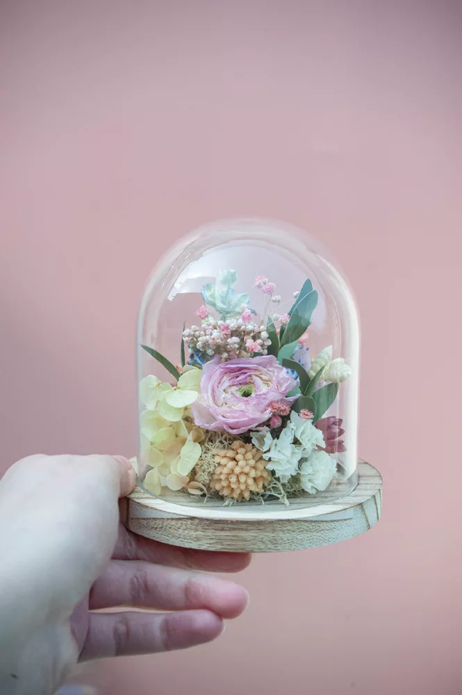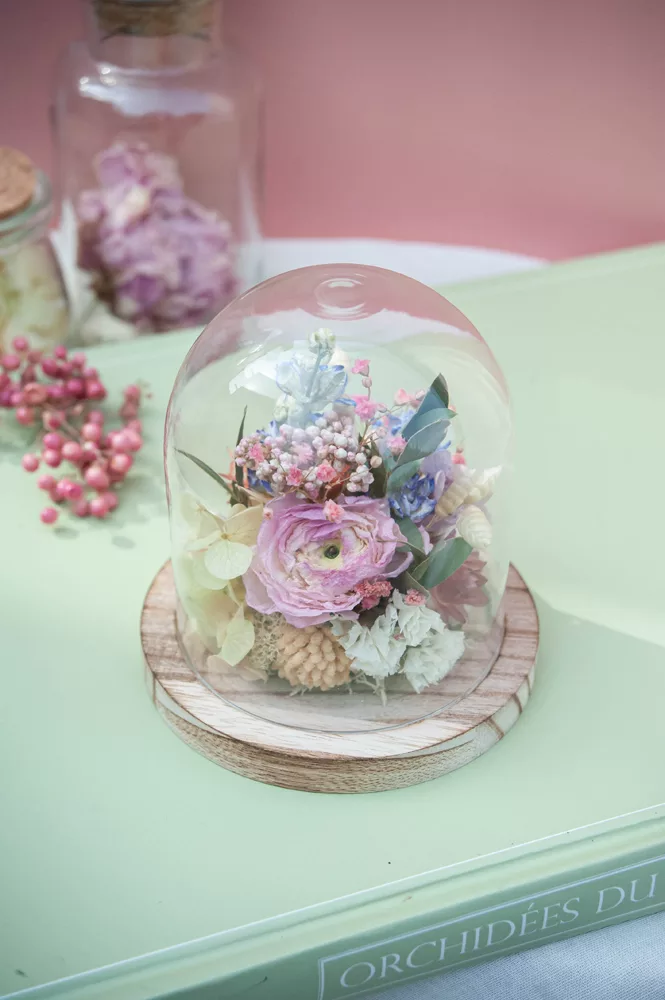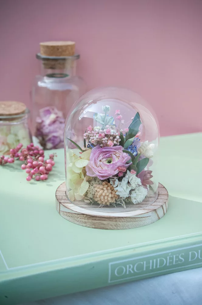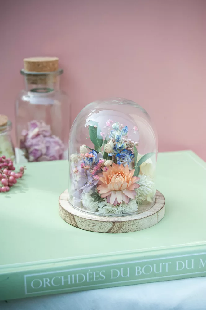 Réalisée à la main avec des fleurs séchées et/ou stabilisées, chaque cloche est composée sans mousse florale (#nofloralfoam), dans une démarche plus respectueuse de l’environnement. La cloche en verre n’est pas scellée : vous pouvez la laisser ouverte ou fermée selon vos envies.