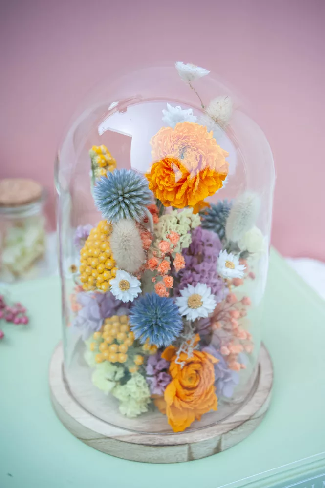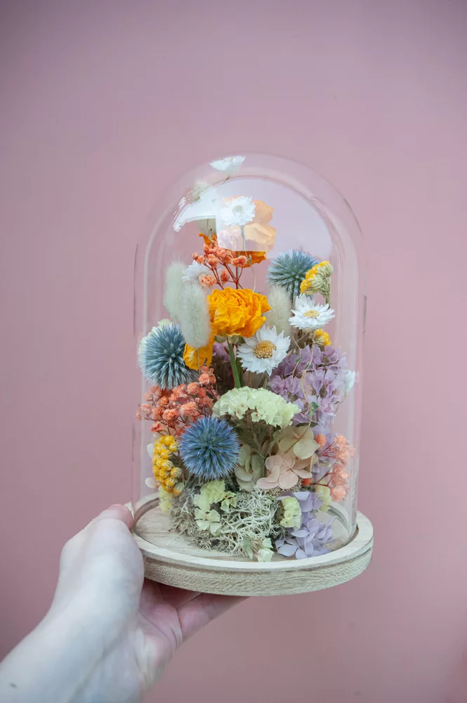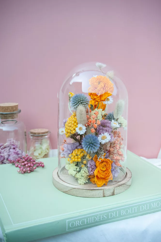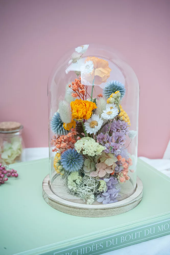 Les fleurs séchées ou stabilisées ne périssent pas et durent plusieurs années. Cependant il est possible que leurs couleurs évoluent avec les années. Pour cela, je vous préconise d’éviter les endroits exposés en plein soleil et les endroits humides. Cette cloche fleurie est réalisée sans mousse florale (mousse à piquer verte) #Nofloralfoam, elle est donc plus écoresponsable ! Toutes mes créations sont réalisées dans mon atelier avec beaucoup de minutie et d’amour. Elles sont entièrement artisanales, c’est pour cela que chaque pièce est unique.