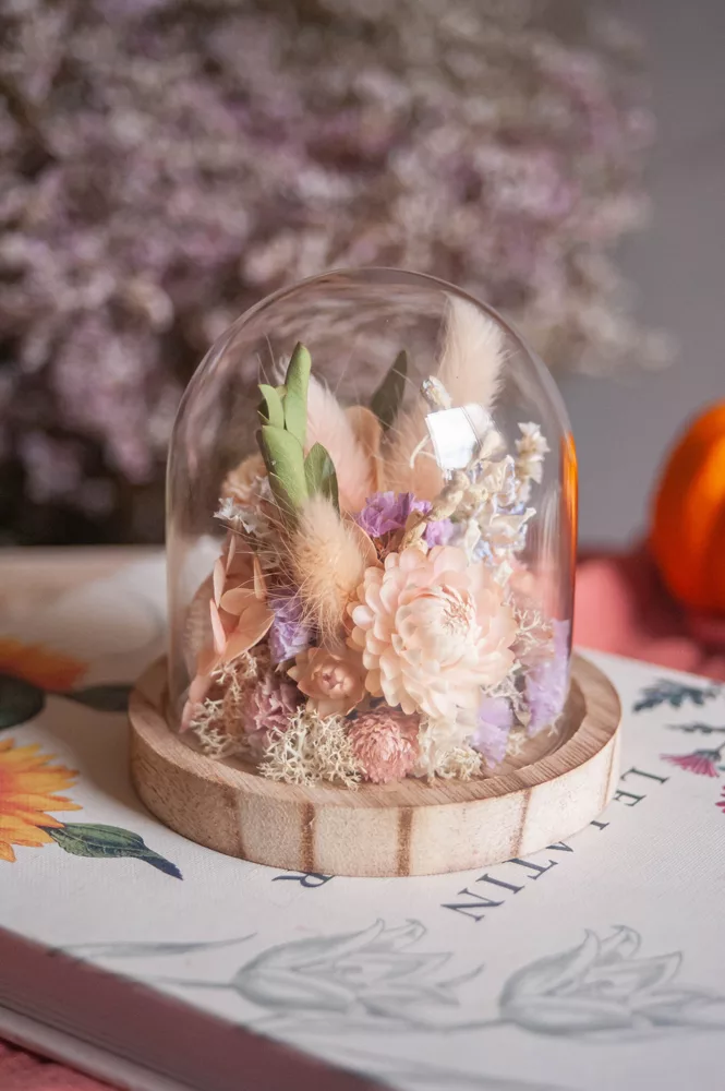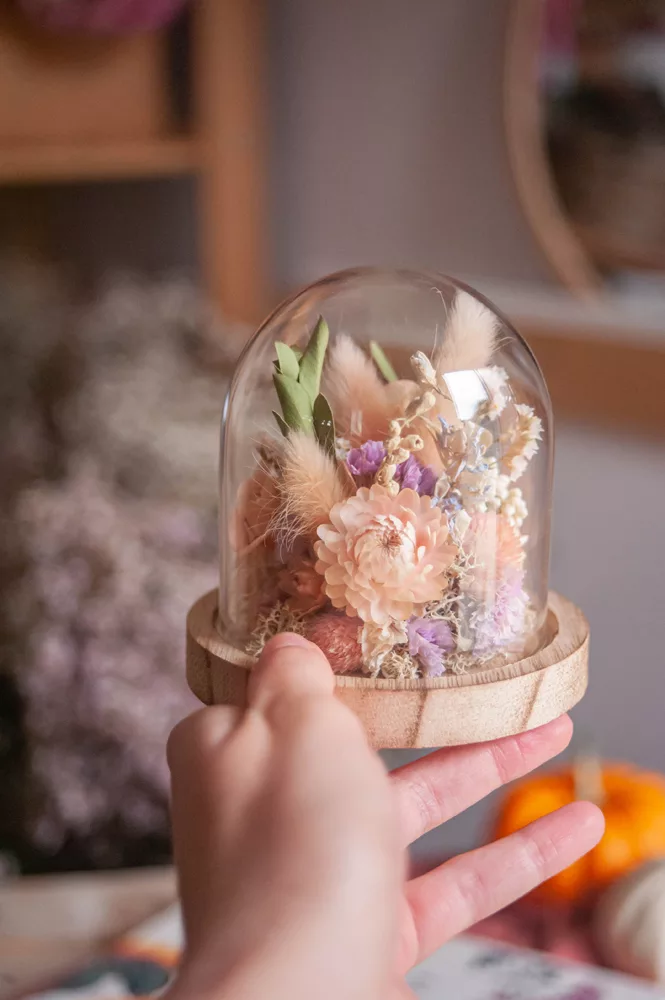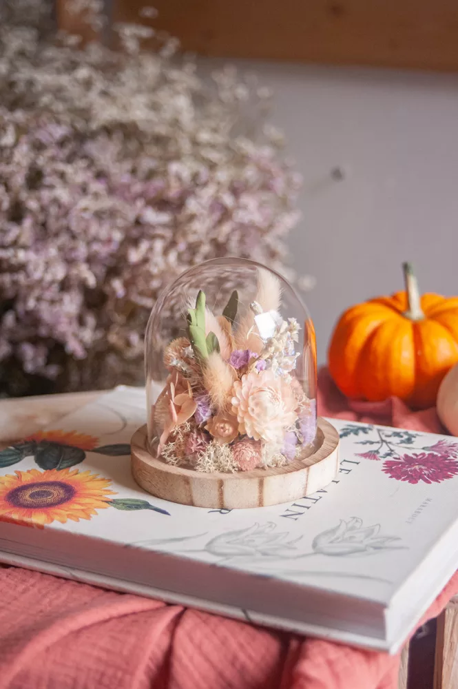 Les fleurs séchées ou stabilisées ne périssent pas et durent plusieurs années. Cependant il est possible que leurs couleurs évoluent avec les années. Pour cela, je vous préconise d’éviter les endroits exposés en plein soleil et les endroits humides. Cette cloche fleurie est réalisée sans mousse florale (mousse à piquer verte) #Nofloralfoam, elle est donc plus écoresponsable ! Toutes mes créations sont réalisées dans mon atelier avec beaucoup de minutie et d’amour. Elles sont entièrement artisanales, c’est pour cela que chaque pièce est unique.
