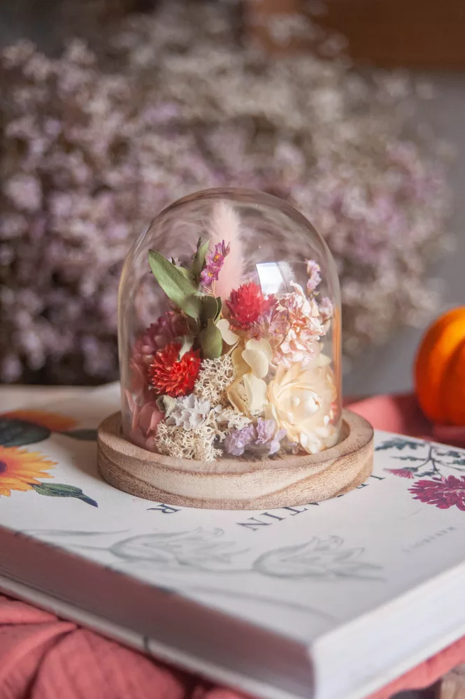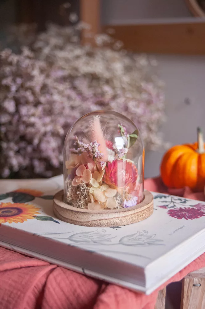 Cette cloche fleurie fera une décoration parfaite pour votre intérieur. Posée sur un meuble ou une étagère, c’est un petit brin de poésie à contempler telle une petite forêt enchantée.