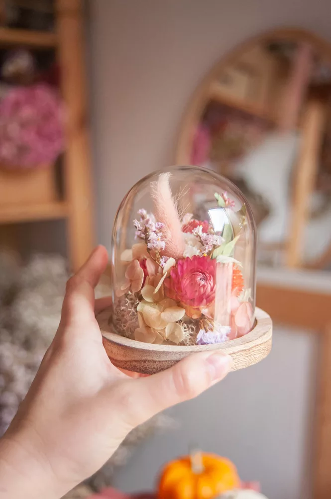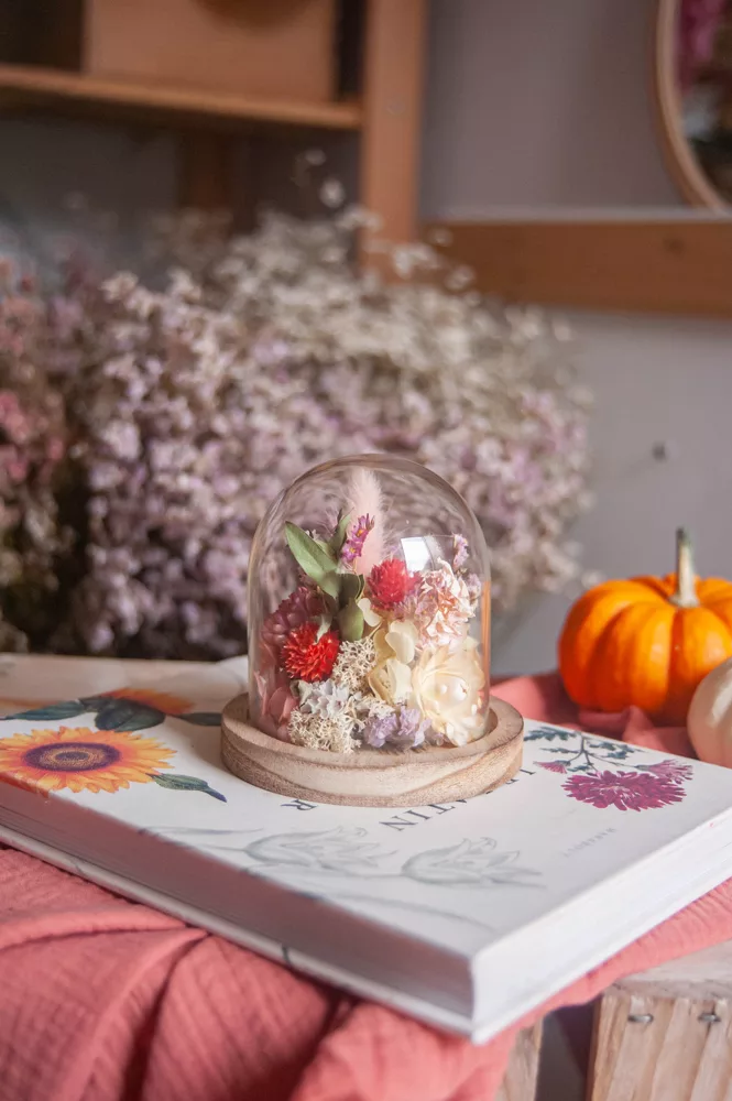 Les fleurs séchées ou stabilisées ne périssent pas et durent plusieurs années. Cependant il est possible que leurs couleurs évoluent avec les années. Pour cela, je vous préconise d’éviter les endroits exposés en plein soleil et les endroits humides. Cette cloche fleurie est réalisée sans mousse florale (mousse à piquer verte) #Nofloralfoam, elle est donc plus écoresponsable ! Toutes mes créations sont réalisées dans mon atelier avec beaucoup de minutie et d’amour. Elles sont entièrement artisanales, c’est pour cela que chaque pièce est unique.