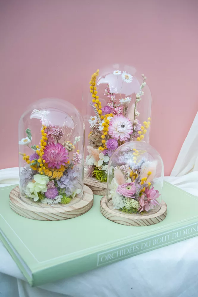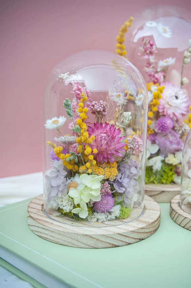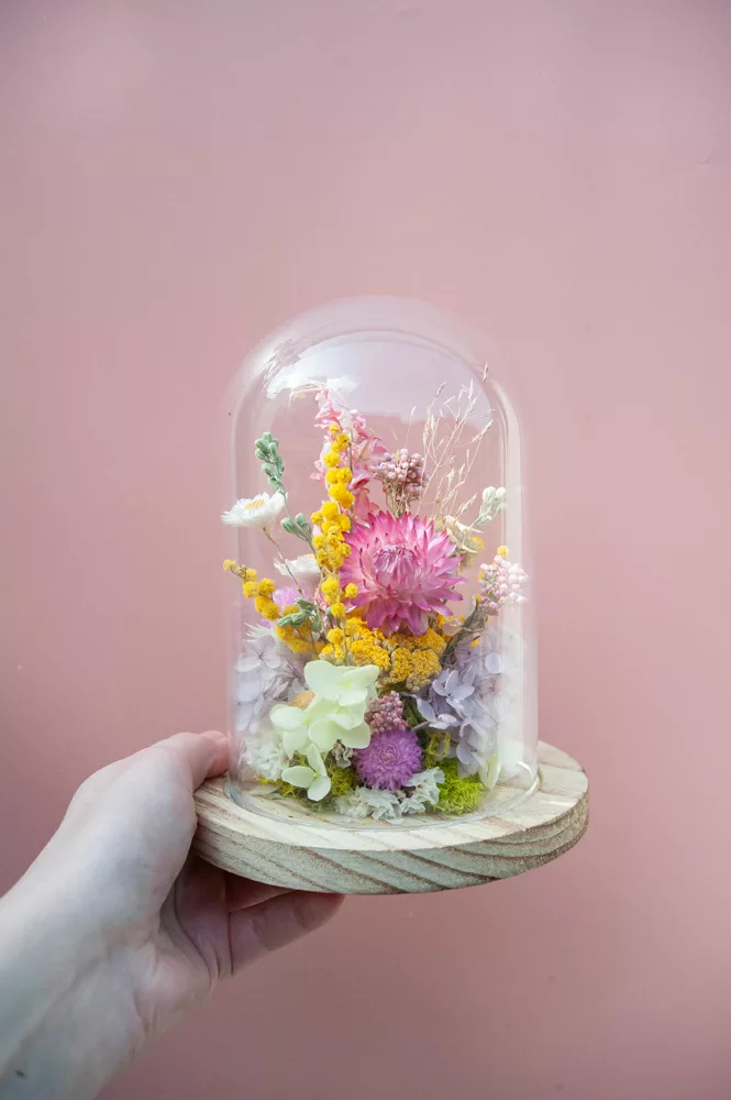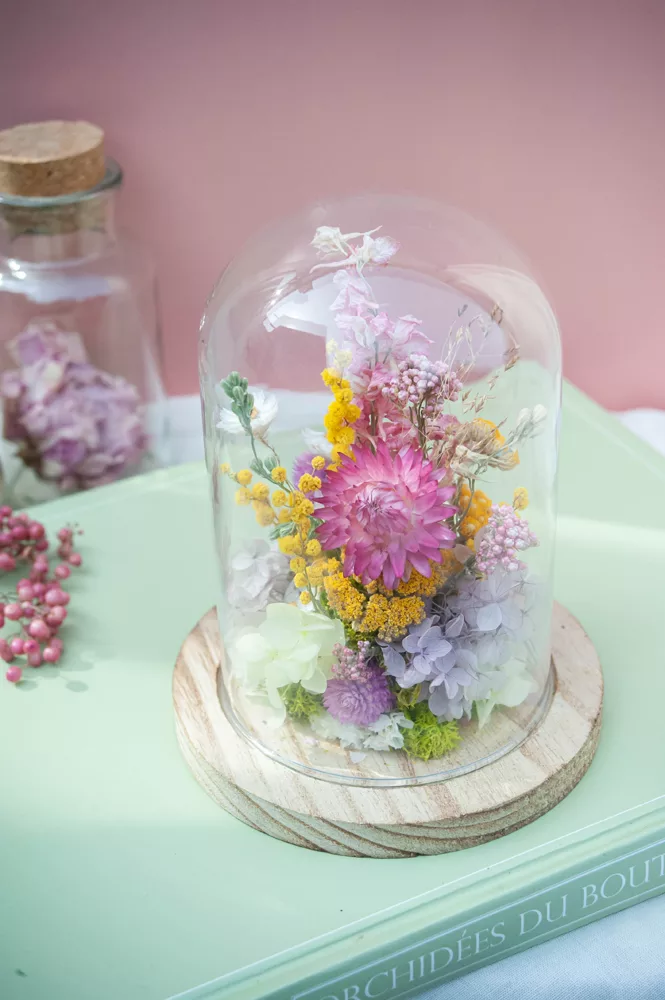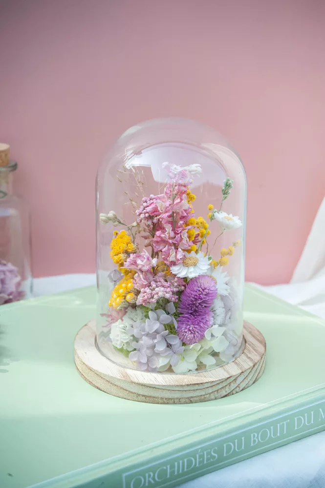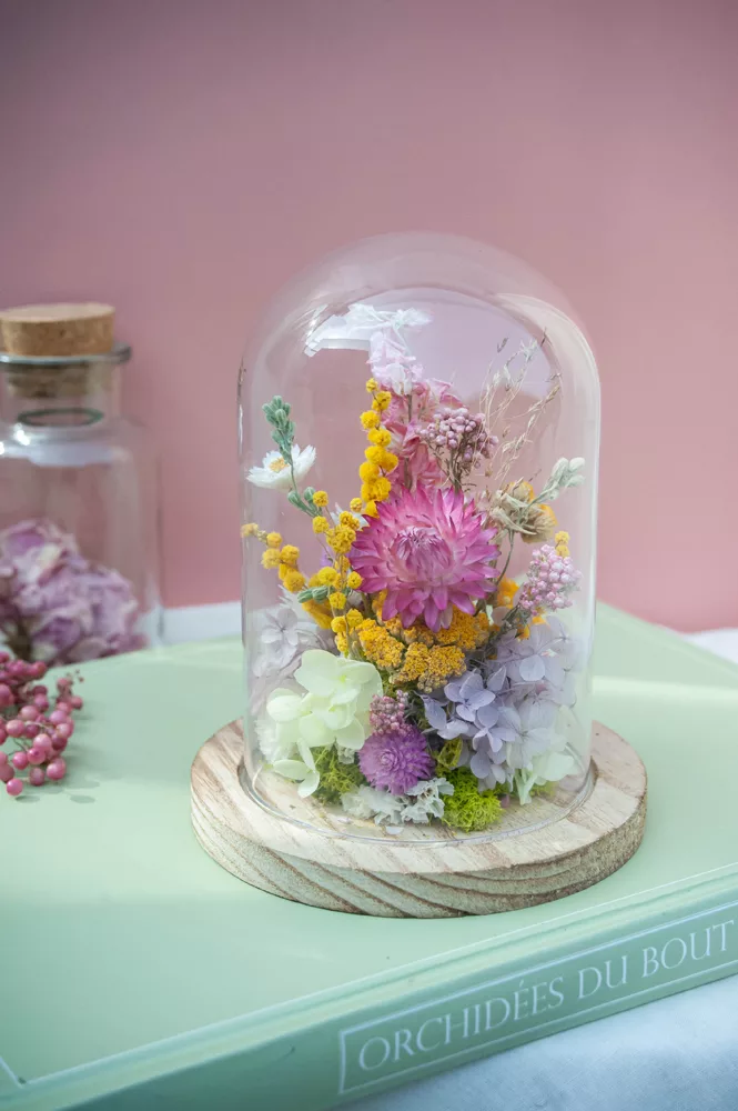 Les fleurs séchées ou stabilisées ne périssent pas et durent plusieurs années. Cependant il est possible que leurs couleurs évoluent avec les années. Pour cela, je vous préconise d’éviter les endroits exposés en plein soleil et les endroits humides. Cette cloche fleurie est réalisée sans mousse florale (mousse à piquer verte) #Nofloralfoam, elle est donc plus écoresponsable ! Toutes mes créations sont réalisées dans mon atelier avec beaucoup de minutie et d’amour. Elles sont entièrement artisanales, c’est pour cela que chaque pièce est unique.