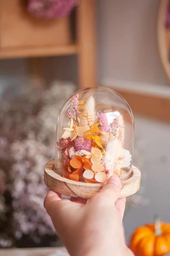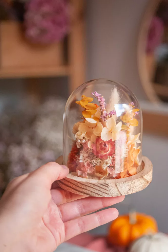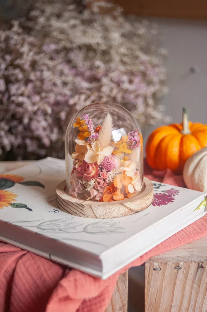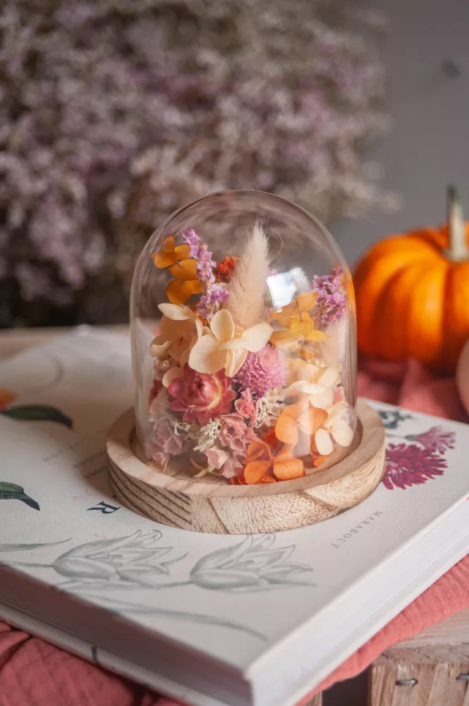 Les fleurs séchées ou stabilisées ne périssent pas et durent plusieurs années. Cependant il est possible que leurs couleurs évoluent avec les années. Pour cela, je vous préconise d’éviter les endroits exposés en plein soleil et les endroits humides. Cette cloche fleurie est réalisée sans mousse florale (mousse à piquer verte) #Nofloralfoam, elle est donc plus écoresponsable ! Toutes mes créations sont réalisées dans mon atelier avec beaucoup de minutie et d’amour. Elles sont entièrement artisanales, c’est pour cela que chaque pièce est unique.