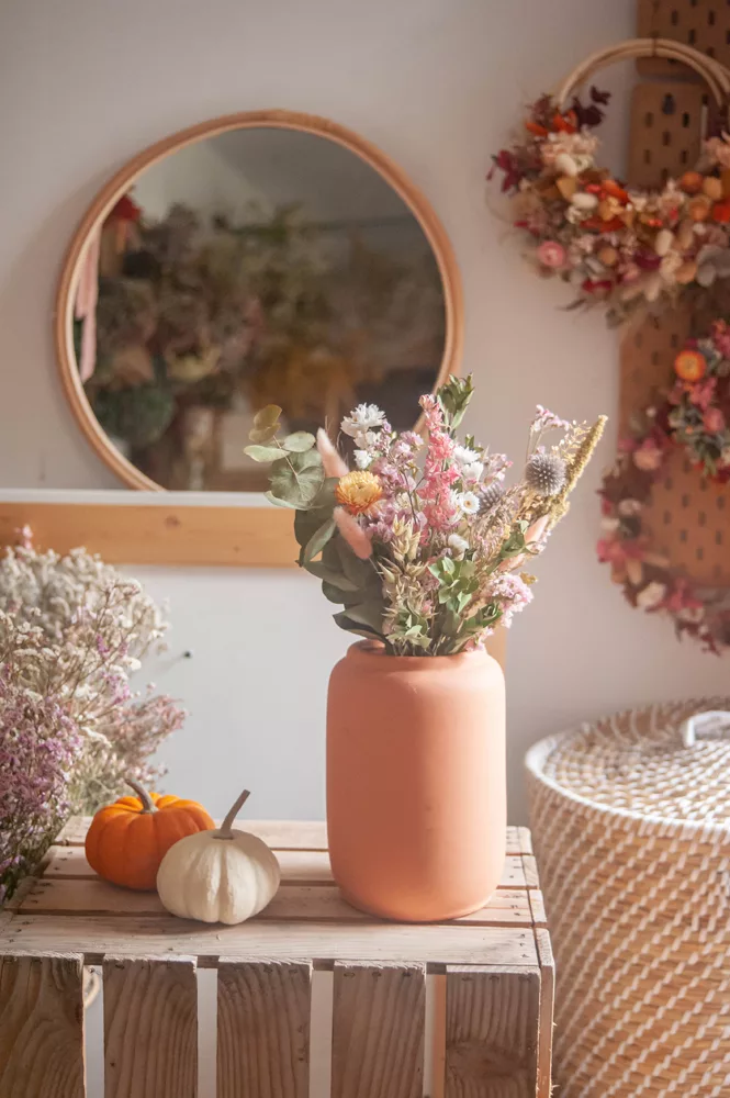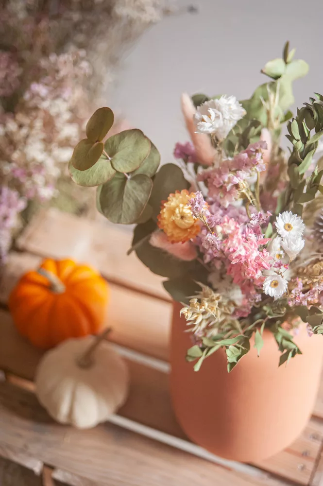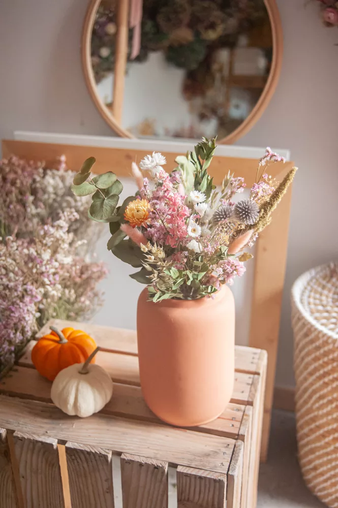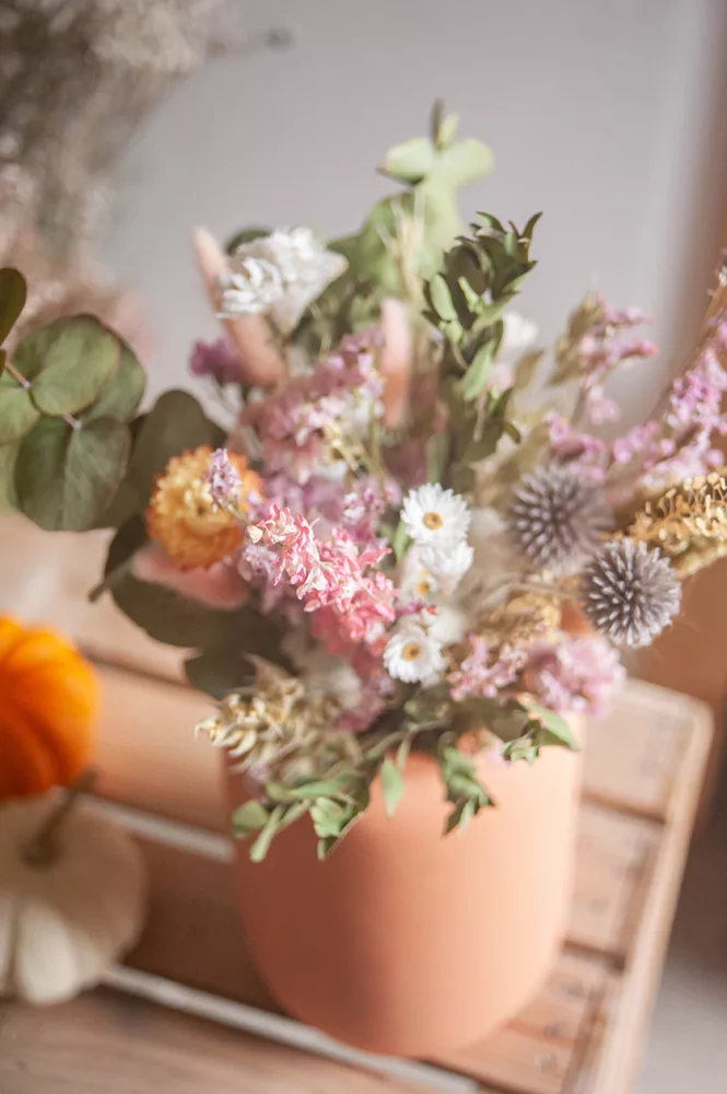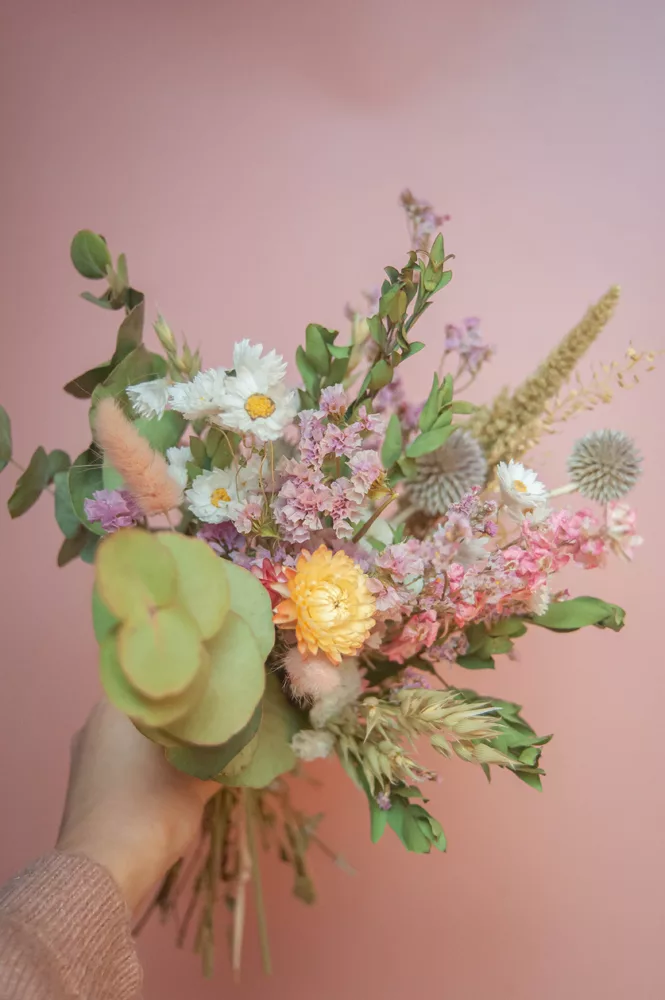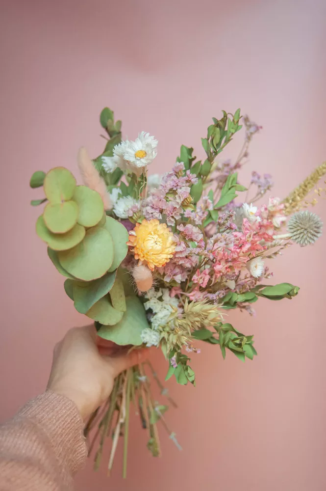 Les avantages des fleurs séchées :Un bouquet qui dure plusieurs mois, voire plusieurs années ! Fini les bouquets qui fanent au bout d’une semaine ! Vous investissez dans une décoration durable et responsable. En effet, jusqu’à 80% des fleurs proviennent de producteurs français, dans le respect du mouvement Slow Flower.