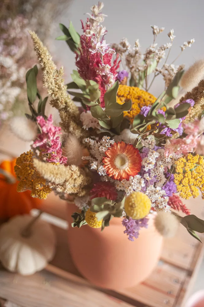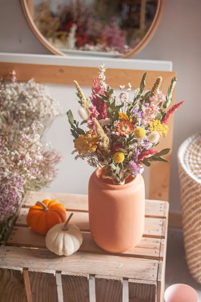 Ce que j’aime avec les fleurs séchées, c’est qu’elles durent dans le temps. Ce bouquet ne fane pas, il vous accompagnera plusieurs mois avant que ses couleurs ne s’adoucissent doucement. Une jolie façon de profiter de l’automne et de créer une ambiance cosy dans votre cocon, ou encore d’offrir un cadeau qui a du sens.