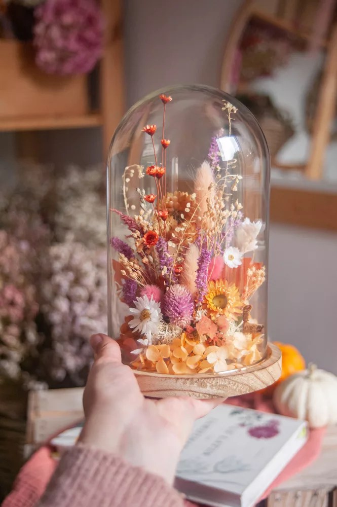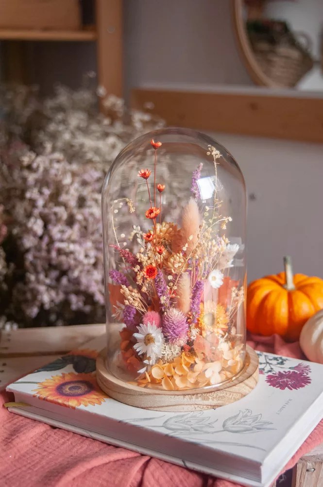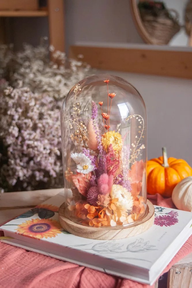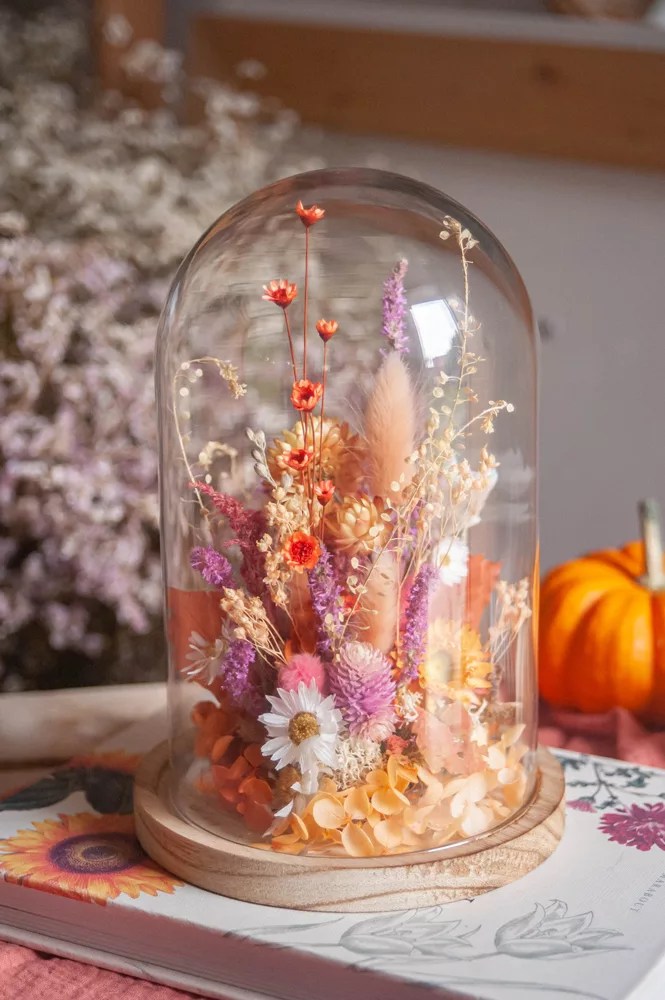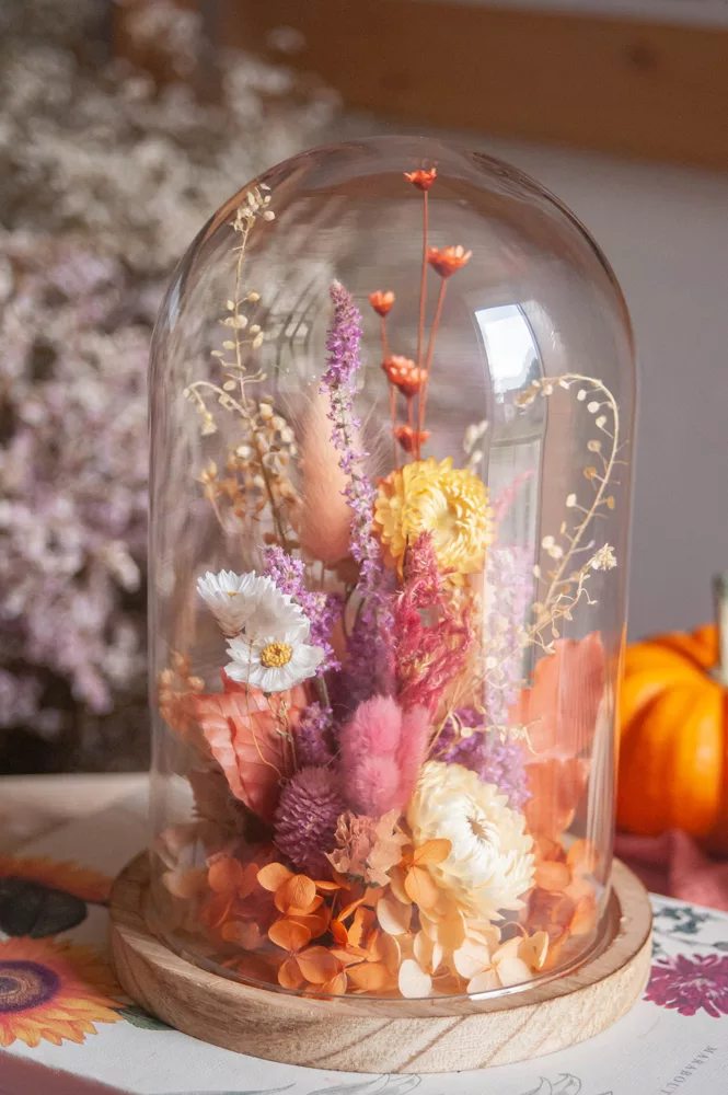 Les fleurs séchées ou stabilisées ne périssent pas et durent plusieurs années. Cependant il est possible que leurs couleurs évoluent avec les années. Pour cela, je vous préconise d’éviter les endroits exposés en plein soleil et les endroits humides. Cette cloche fleurie est réalisée sans mousse florale (mousse à piquer verte) #Nofloralfoam, elle est donc plus écoresponsable ! Toutes mes créations sont réalisées dans mon atelier avec beaucoup de minutie et d’amour. Elles sont entièrement artisanales, c’est pour cela que chaque pièce est unique.