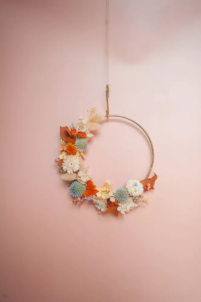 Cette jolie couronne sur cercle en laiton doré est composée d’un mélange coloré dans les tons oranges, roses et crèmes.