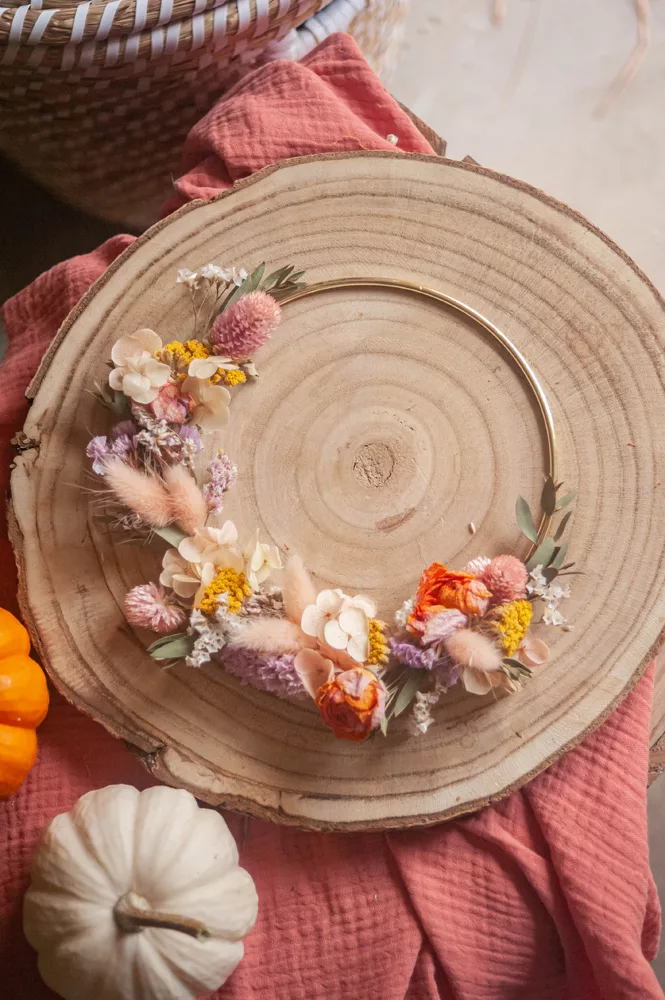 Cette jolie couronne sur cercle en laiton doré est composée d’un mélange coloré dans les tons jaunes, roses, crèmes et vertes.