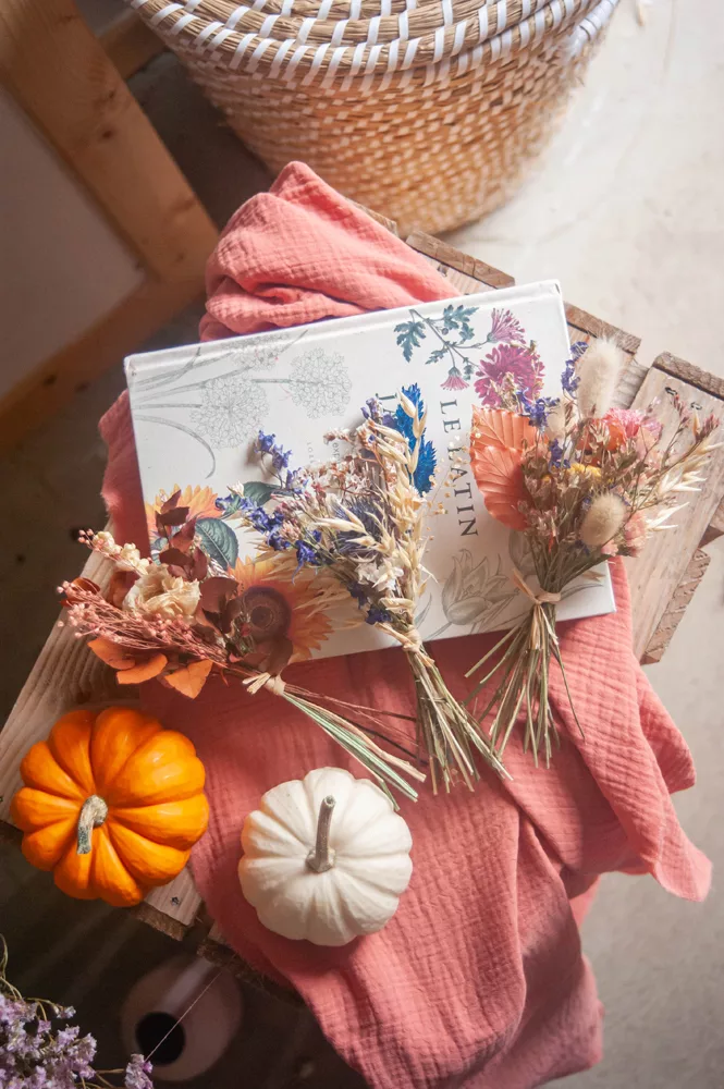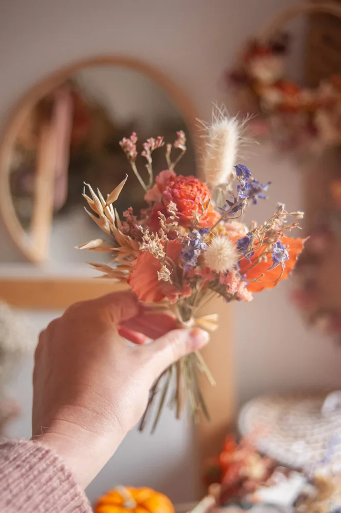 Comment les fleurs sont-elles séchées ? Une fois la récolte effectuée pendant l’été, elles vont passer plusieurs semaines la tête en bas à l’abri du soleil. Cette technique de séchage permet de garder tout l’éclat de la fleur pendant plusieurs mois. Le respect de la nature est au cœur de ma démarche c’est pour cela que jusqu’à 80 % de mes fleurs viennent de producteurs français !