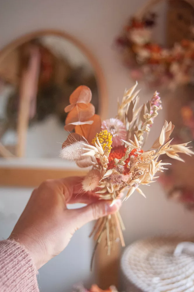 Comment les fleurs sont-elles séchées ? Une fois la récolte effectuée pendant l’été, elles vont passer plusieurs semaines la tête en bas à l’abri du soleil. Cette technique de séchage permet de garder tout l’éclat de la fleur pendant plusieurs mois. Le respect de la nature est au cœur de ma démarche c’est pour cela que jusqu’à 80 % de mes fleurs viennent de producteurs français !
