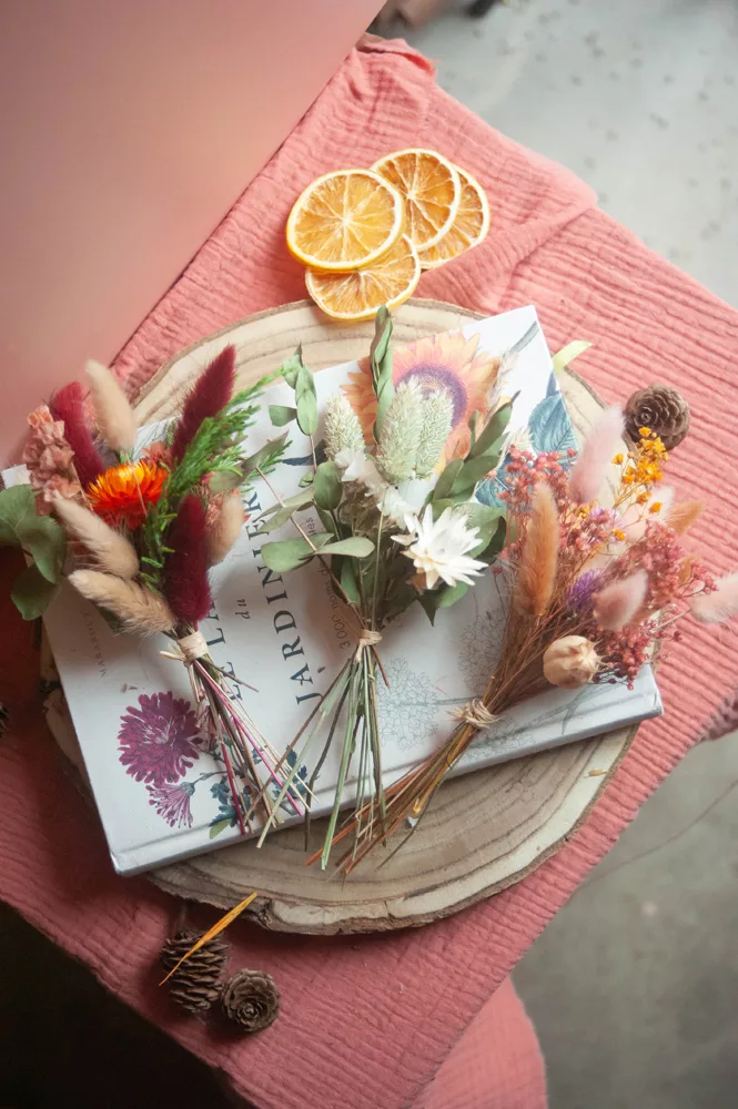 Les ensembles de mini-bouquets sont composés de différentes variétés de fleurs séchées et stabilisés.