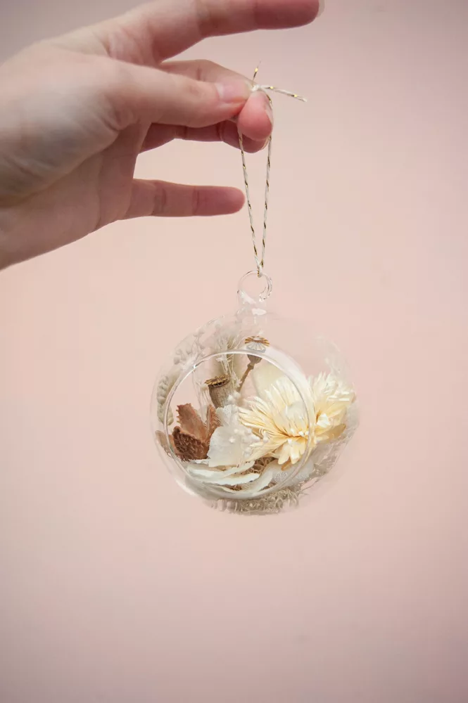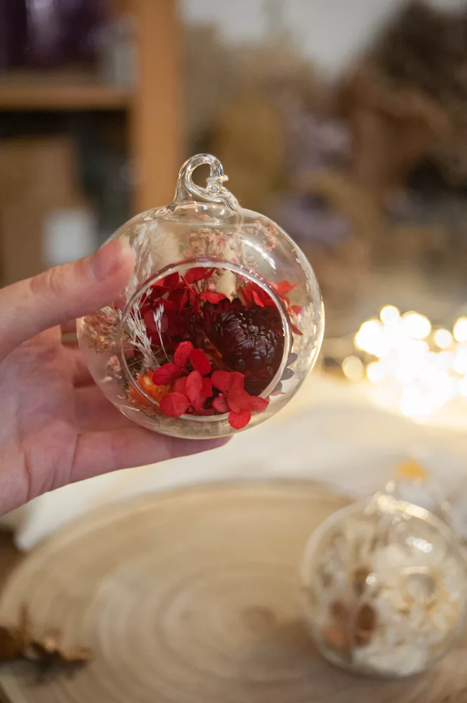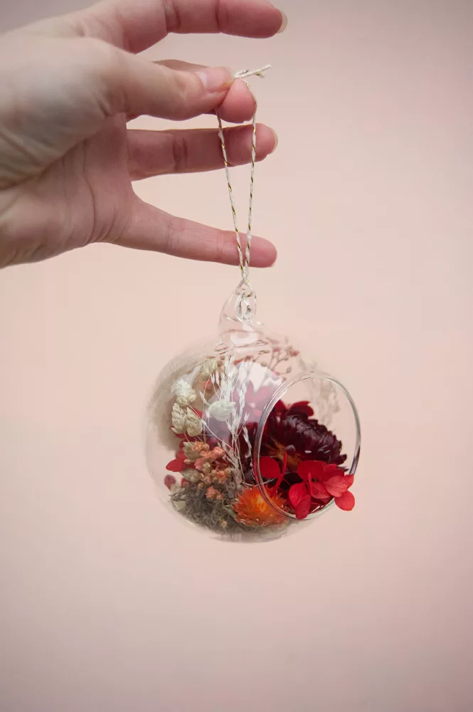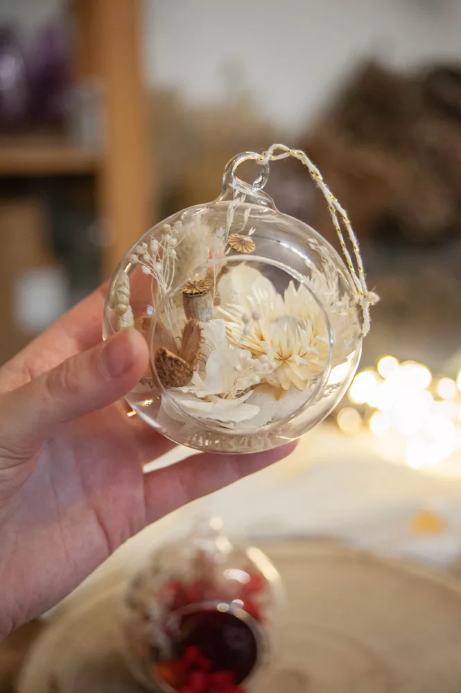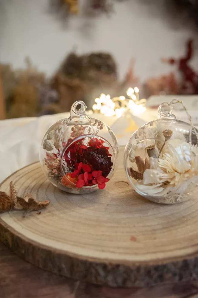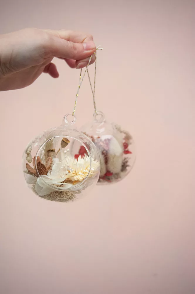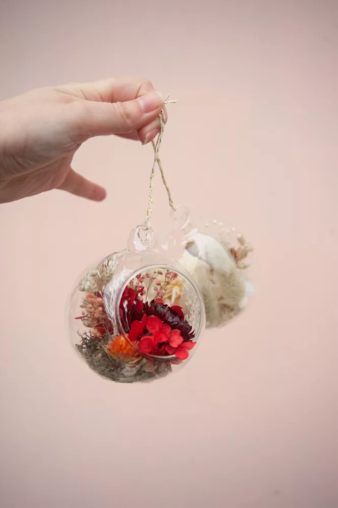 Les boules de Noël en fleurs séchées et stabilisées peuvent contenir différents végétaux, l’utilisation des fleurs séchées vous garantit une création décorative durable. Puisque ces dernières ne fanent jamais, vous pourrez réutiliser cette décoration de Noël l’année suivante sans problème ! Pour éviter que vos fleurs séchées ne décolorent à mesure que le temps passe, veillez à ne pas exposer votre boule au soleil et évitez les pièces humides.