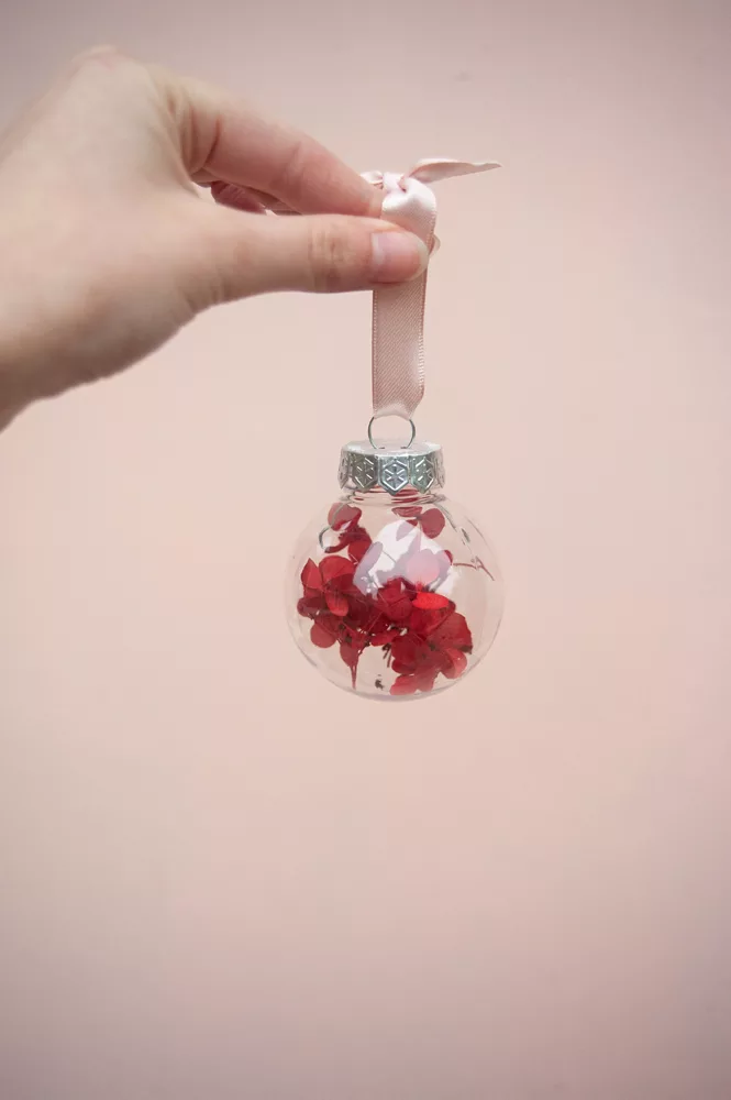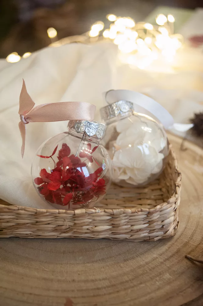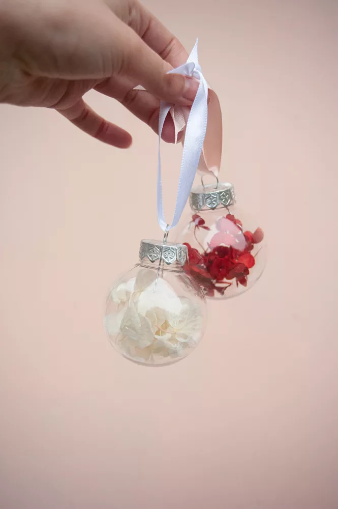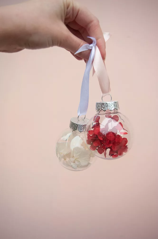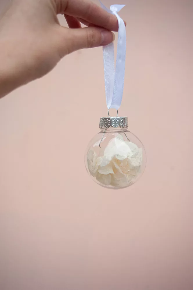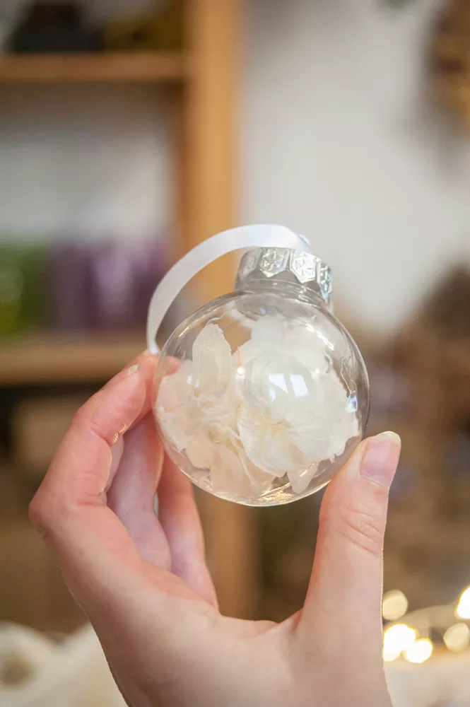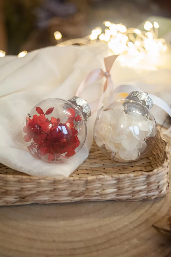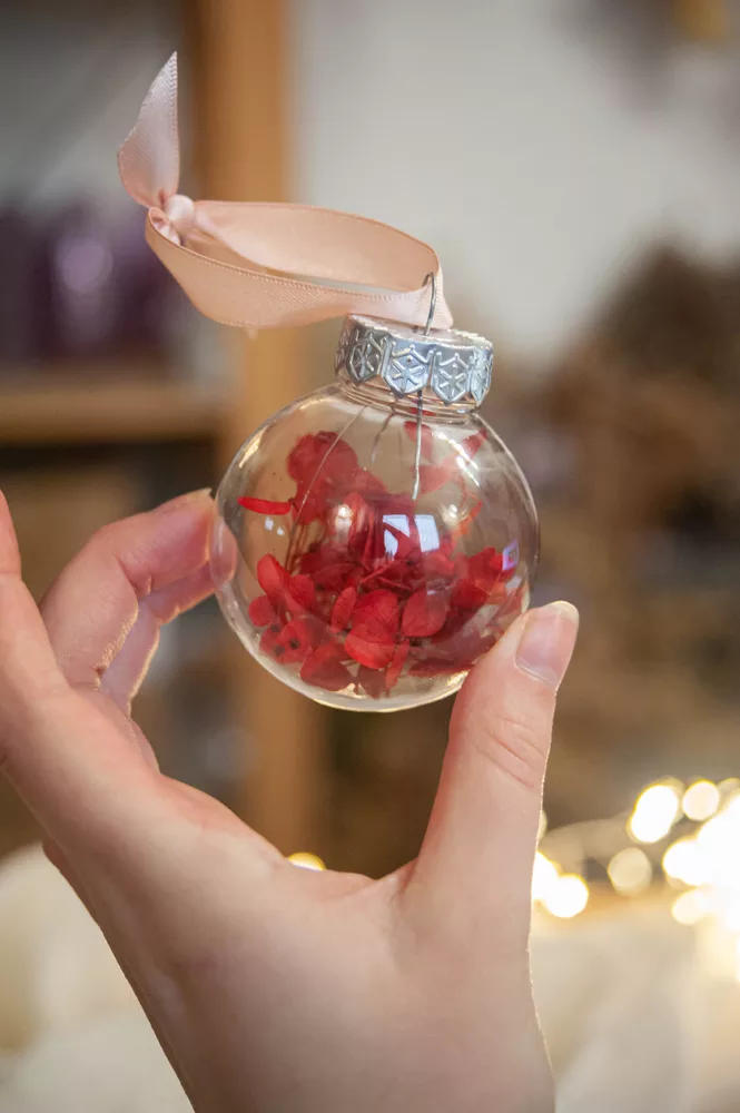 Les boules de Noël en fleurs séchées et stabilisées peuvent contenir différents végétaux, l’utilisation des fleurs séchées vous garantit une création décorative durable. Puisque ces dernières ne fanent jamais, vous pourrez réutiliser cette décoration de Noël l’année suivante sans problème ! Pour éviter que vos fleurs séchées ne décolorent à mesure que le temps passe, veillez à ne pas exposer votre boule au soleil et évitez les pièces humides.