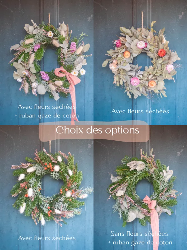 Composée d’un mélange harmonieux de feuillages frais sapin, cyprès, baies, bruyère et de délicats fleurs séchés sélectionnées selon votre option choisie, cette couronne de Noël a été confectionnée avec passion dans mon atelier des Hauts-de-France. Chaque pièce est unique, réalisée avec des matériaux naturels et une attention particulière aux détails.
