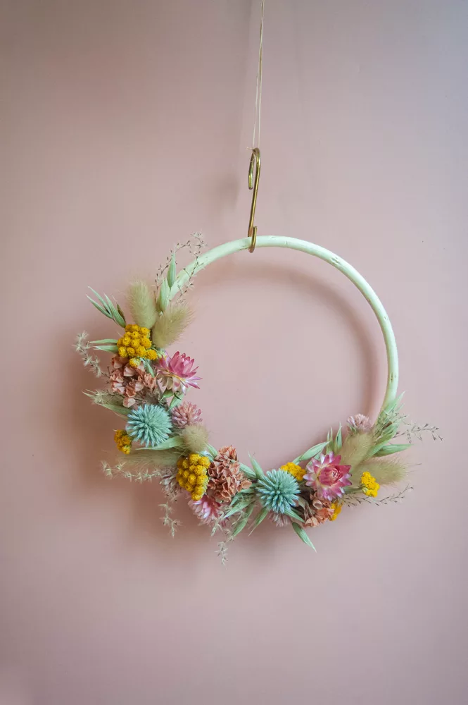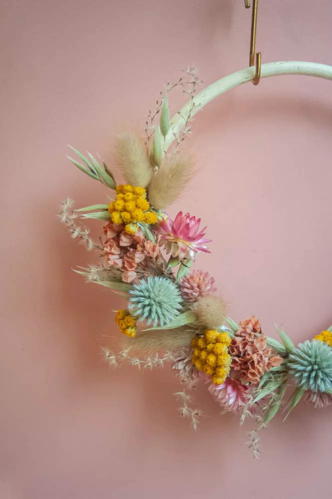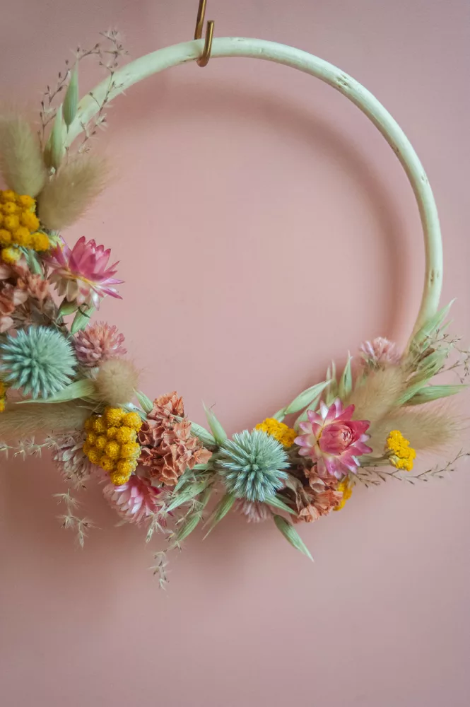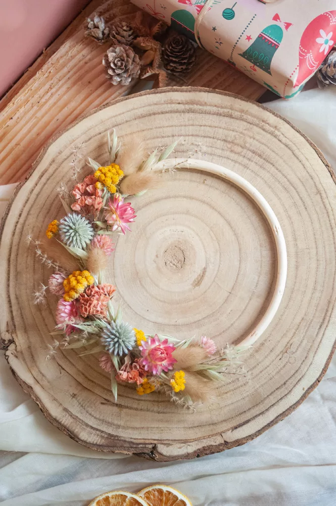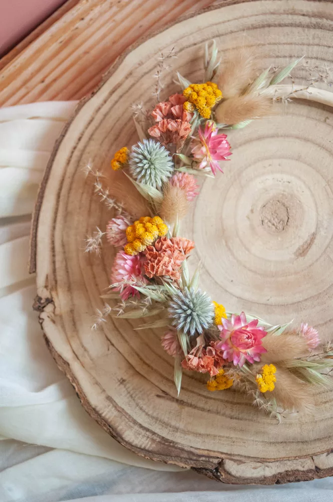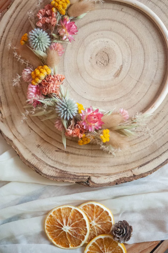 Les avantages des fleurs séchées : Fini les bouquets qui fanent en quelques jours ! Les couronnes en fleurs séchées durent plusieurs mois, voire plusieurs années. Une alternative durable à la fleur fraîche, qui vous permet de profiter longtemps de la beauté florale sans gaspillage.