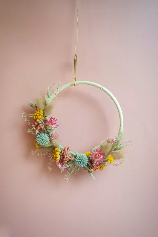 Cette couronne est composée d’un délicat mélange 100% de fleurs séchées venant de chez mon producteur partenaire Terralya.
