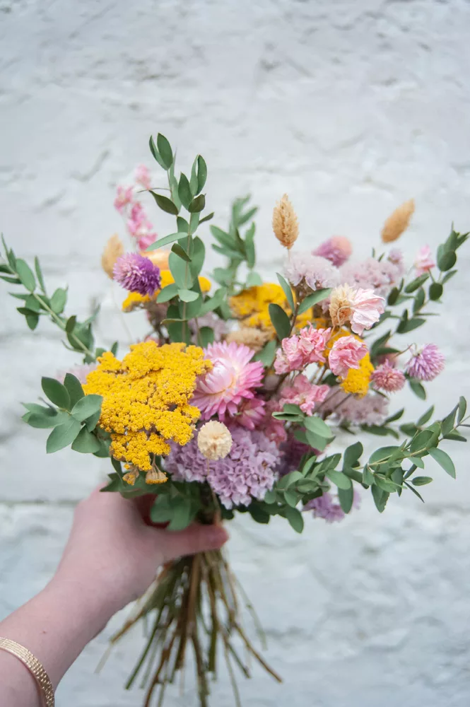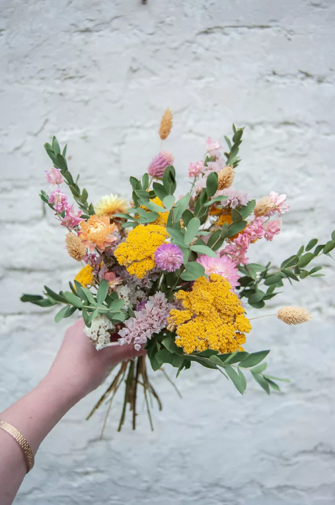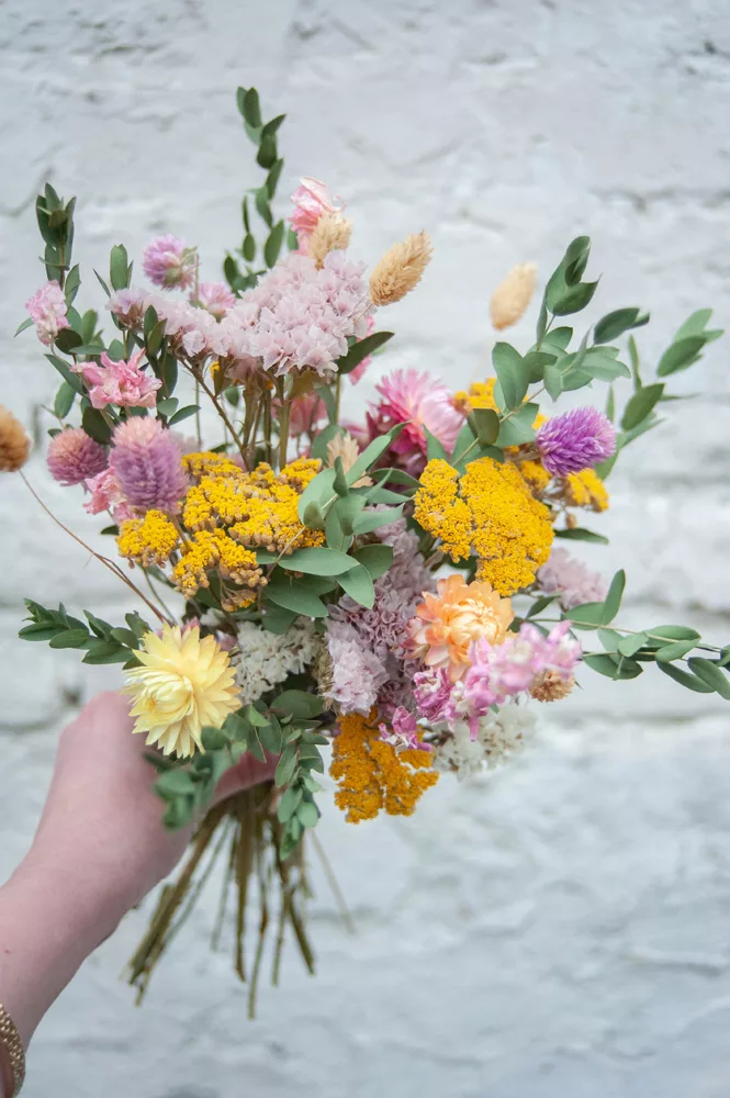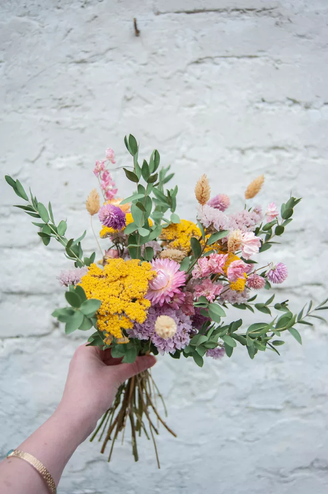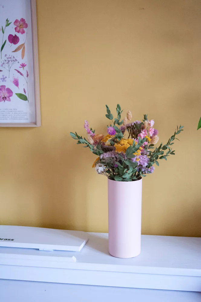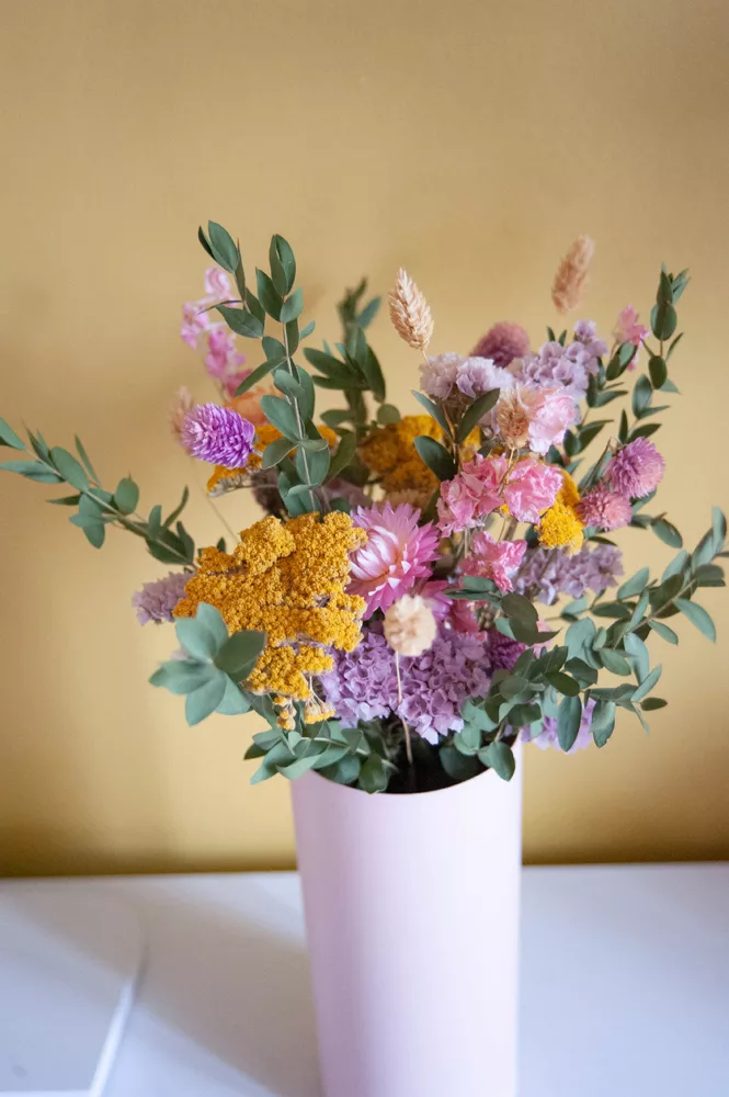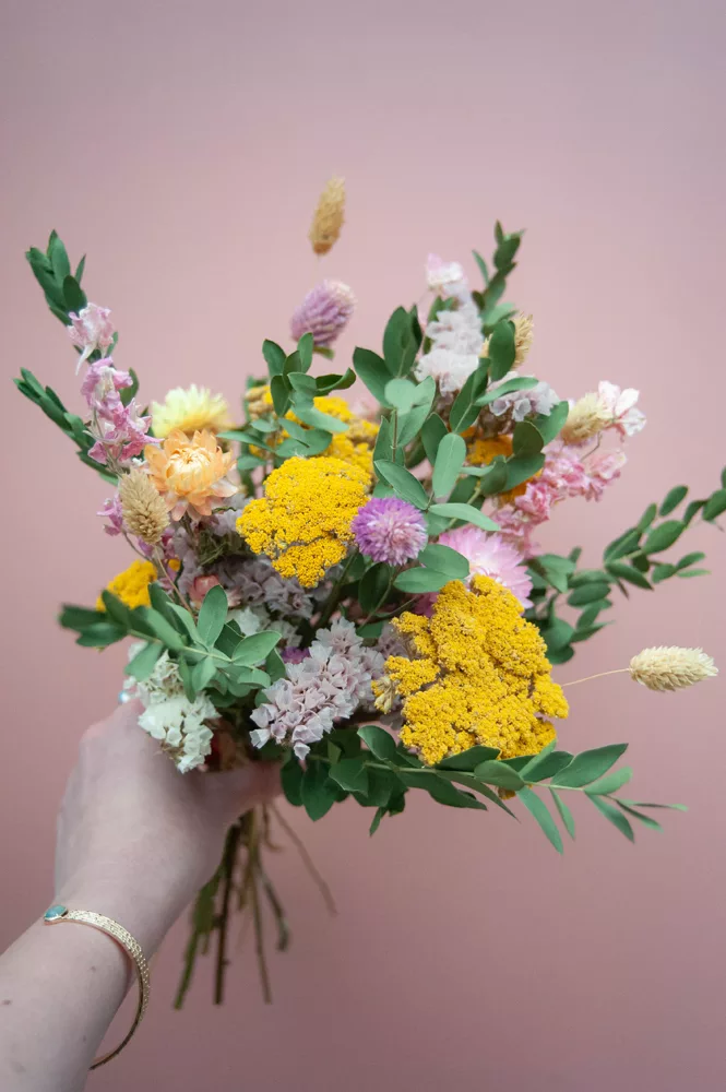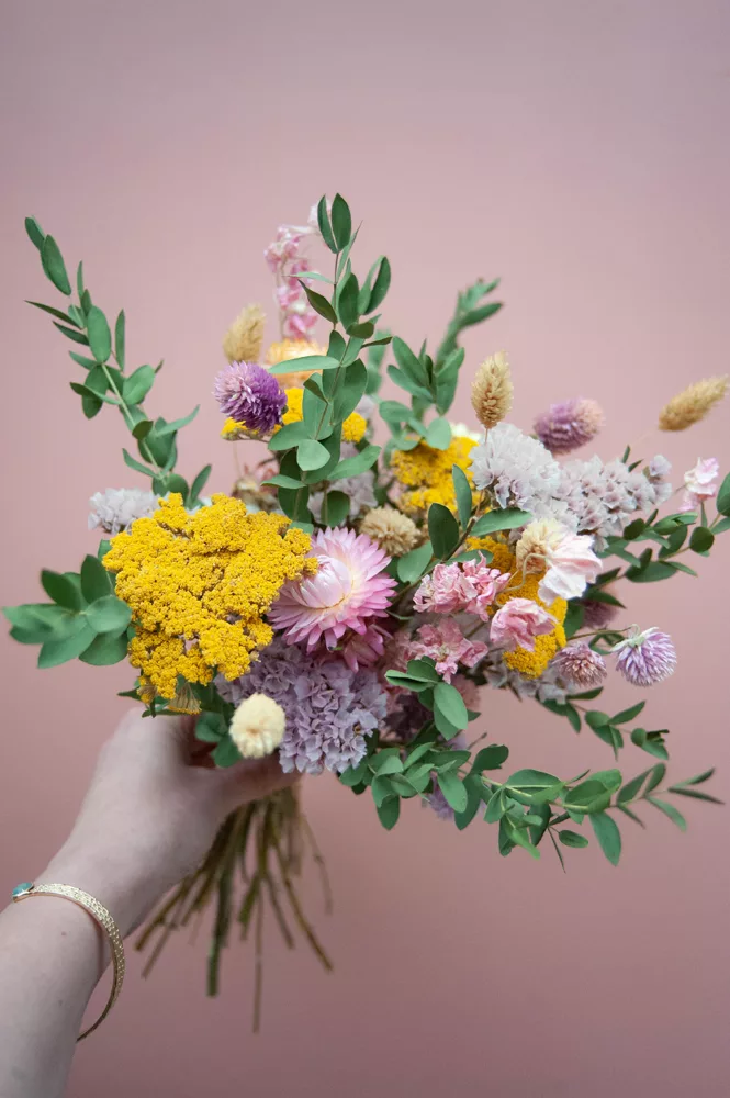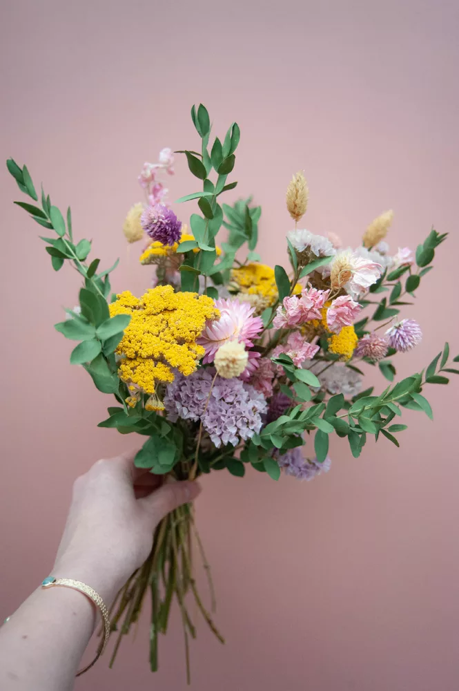 Les avantages des fleurs séchées : Un bouquet qui dure plusieurs mois, voire plusieurs années ! Fini les bouquets qui fanent au bout d’une semaine ! Vous investissez dans une décoration durable et responsable. En effet, entre 60 % et 80 % des fleurs proviennent de producteurs français, dans le respect du mouvement Slow Flower.