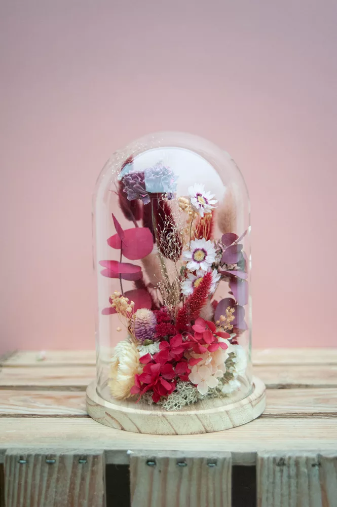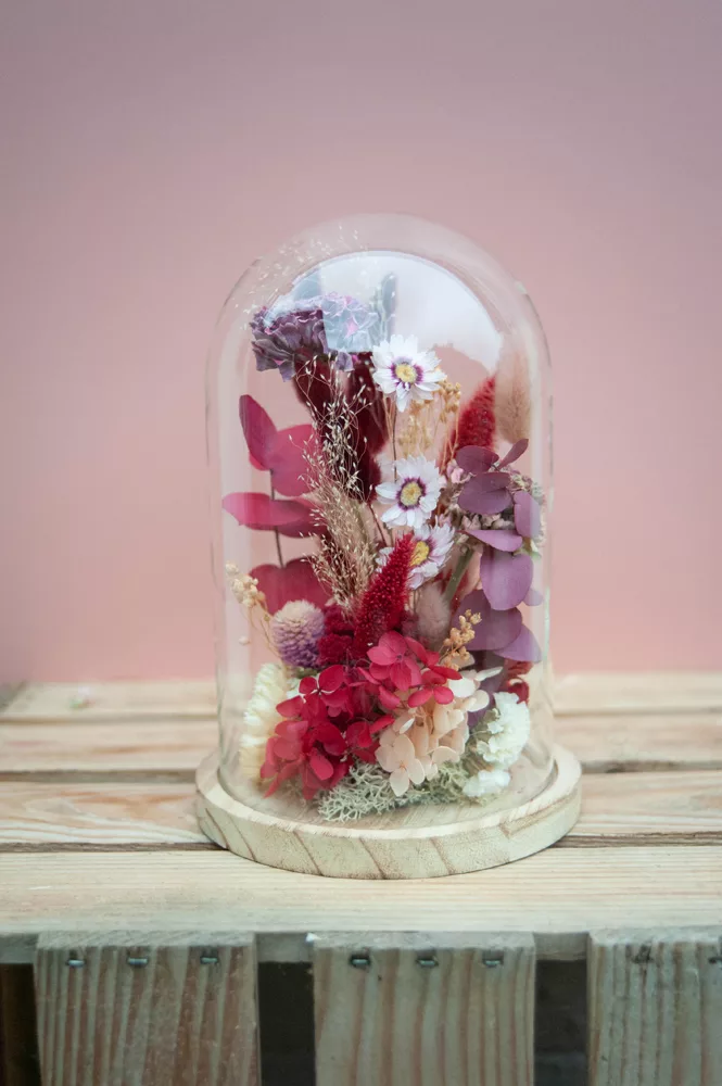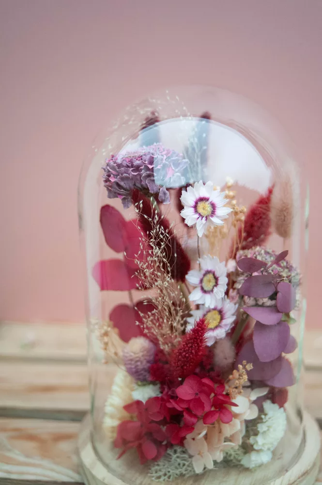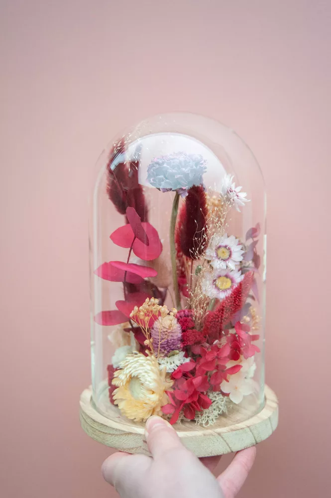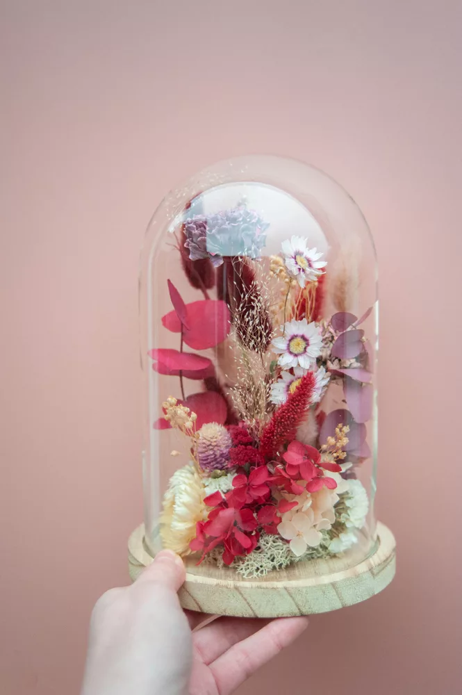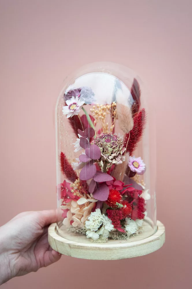 Les fleurs séchées ou stabilisées ne périssent pas et durent plusieurs années. Cependant il est possible que leurs couleurs évoluent avec les années. Pour cela, je vous préconise d’éviter les endroits exposés en plein soleil et les endroits humides. Cette cloche fleurie est réalisée sans mousse florale (mousse à piquer verte) #Nofloralfoam, elle est donc plus écoresponsable ! Toutes mes créations sont réalisées dans mon atelier avec beaucoup de minutie et d’amour. Elles sont entièrement artisanales, c’est pour cela que chaque pièce est unique.