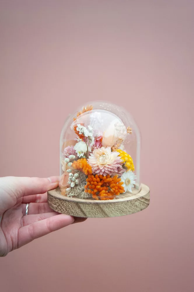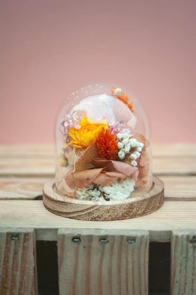 Les fleurs séchées ou stabilisées ne périssent pas et durent plusieurs années. Cependant il est possible que leurs couleurs évoluent avec les années. Pour cela, je vous préconise d’éviter les endroits exposés en plein soleil et les endroits humides. Cette cloche fleurie est réalisée sans mousse florale (mousse à piquer verte) #Nofloralfoam, elle est donc plus écoresponsable ! Toutes mes créations sont réalisées dans mon atelier avec beaucoup de minutie et d’amour. Elles sont entièrement artisanales, c’est pour cela que chaque pièce est unique.