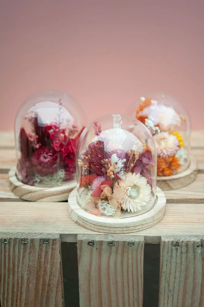 Les fleurs séchées ou stabilisées ne périssent pas et durent plusieurs années. Cependant il est possible que leurs couleurs évoluent avec les années. Pour cela, je vous préconise d’éviter les endroits exposés en plein soleil et les endroits humides. Cette cloche fleurie est réalisée sans mousse florale (mousse à piquer verte) #Nofloralfoam, elle est donc plus écoresponsable ! Toutes mes créations sont réalisées dans mon atelier avec beaucoup de minutie et d’amour. Elles sont entièrement artisanales, c’est pour cela que chaque pièce est unique.