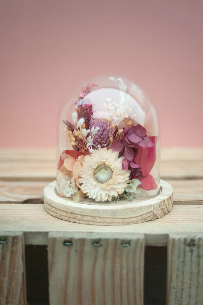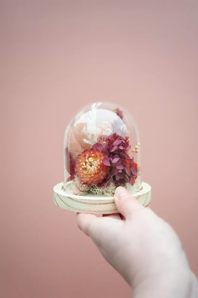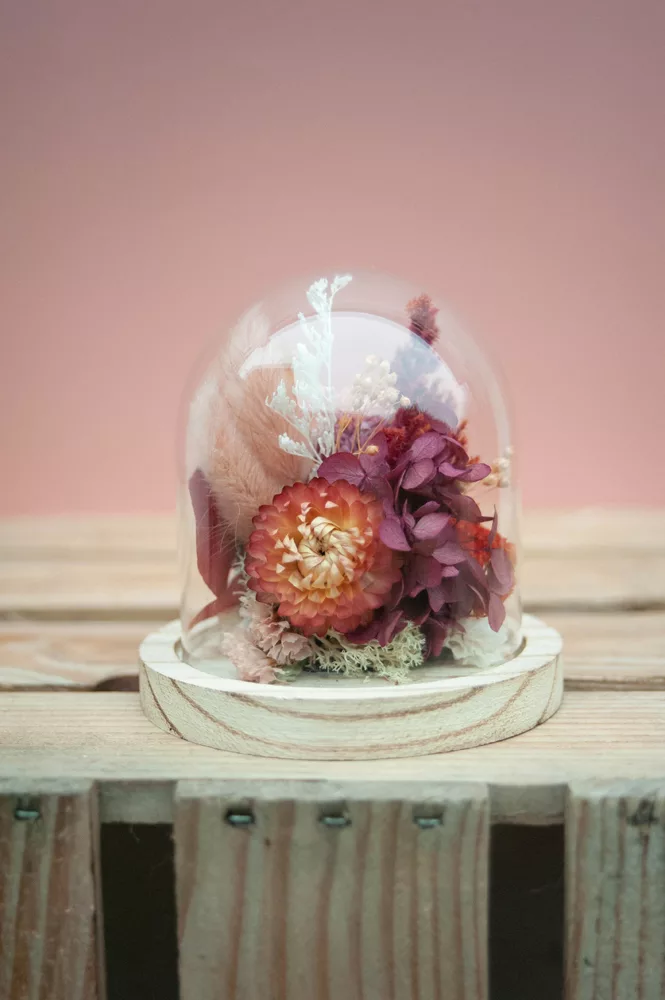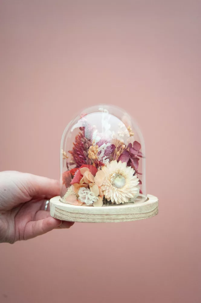 Réalisée à la main avec des fleurs séchées et/ou stabilisées, chaque cloche est composée sans mousse florale (#nofloralfoam), dans une démarche plus respectueuse de l’environnement. La cloche en verre n’est pas scellée : vous pouvez la laisser ouverte ou fermée selon vos envies.