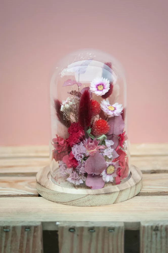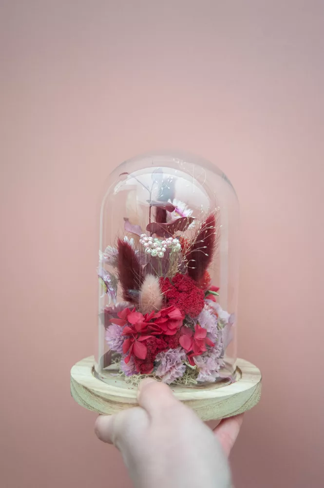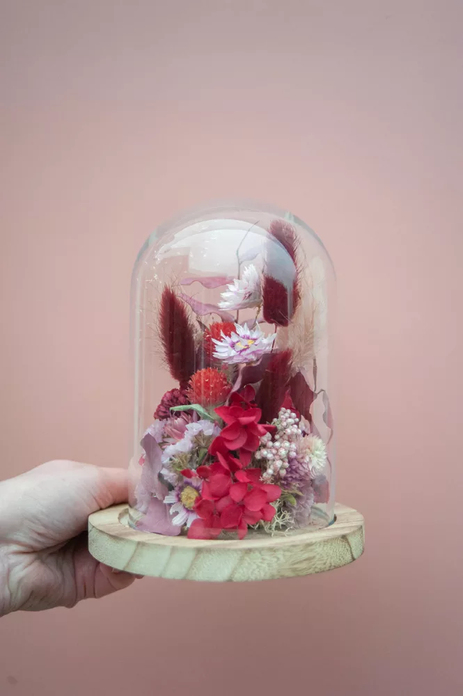 Réalisée à la main avec des fleurs séchées et/ou stabilisées, chaque cloche est composée sans mousse florale (#nofloralfoam), dans une démarche plus respectueuse de l’environnement. La cloche en verre n’est pas scellée : vous pouvez la laisser ouverte ou fermée selon vos envies.