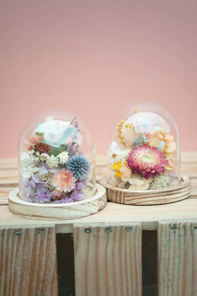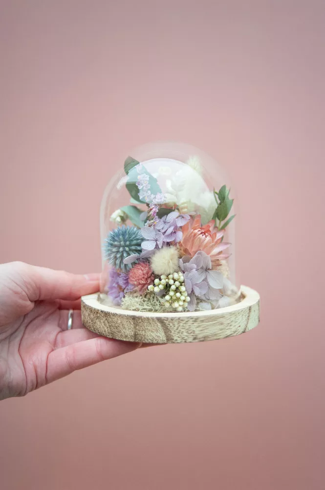 Les fleurs séchées ou stabilisées ne périssent pas et durent plusieurs années. Cependant il est possible que leurs couleurs évoluent avec les années. Pour cela, je vous préconise d’éviter les endroits exposés en plein soleil et les endroits humides. Cette cloche fleurie est réalisée sans mousse florale (mousse à piquer verte) #Nofloralfoam, elle est donc plus écoresponsable ! Toutes mes créations sont réalisées dans mon atelier avec beaucoup de minutie et d’amour. Elles sont entièrement artisanales, c’est pour cela que chaque pièce est unique.