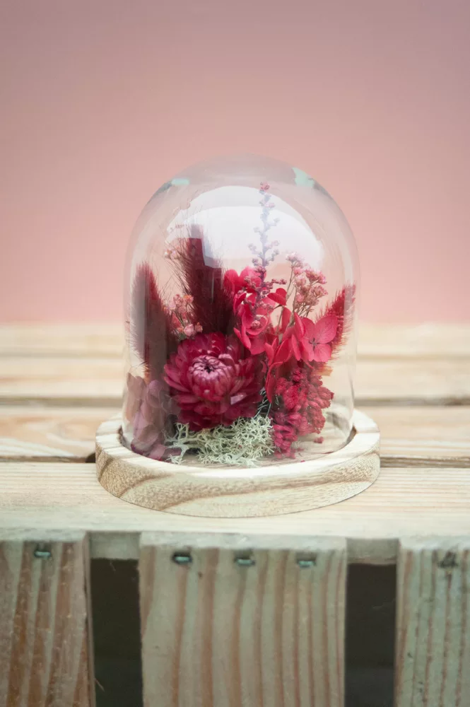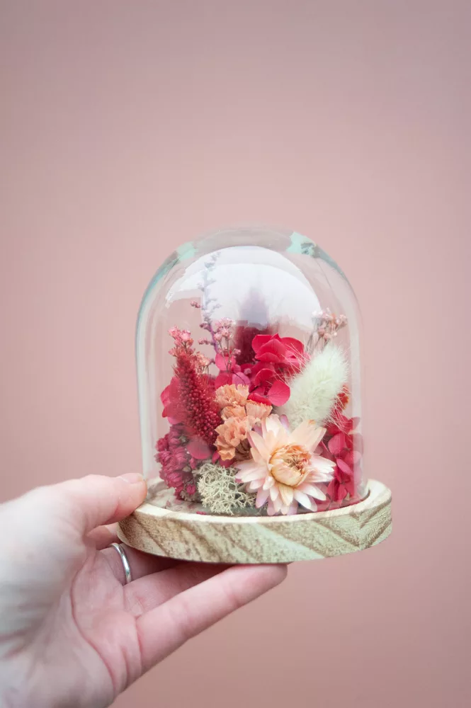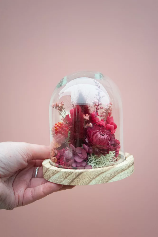 Réalisée à la main avec des fleurs séchées et/ou stabilisées, chaque cloche est composée sans mousse florale (#nofloralfoam), dans une démarche plus respectueuse de l’environnement. La cloche en verre n’est pas scellée : vous pouvez la laisser ouverte ou fermée selon vos envies.
