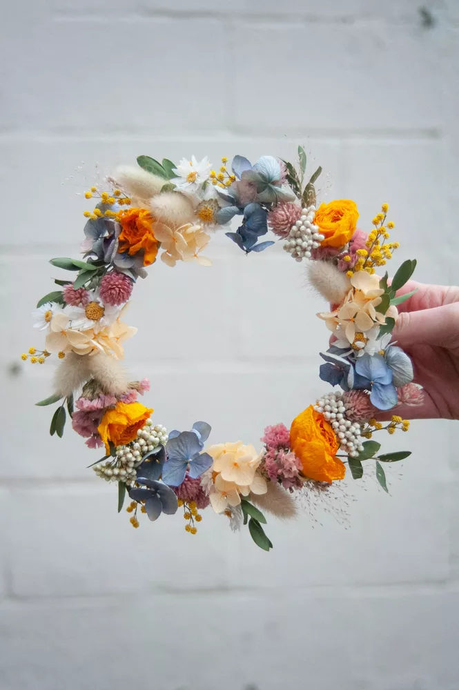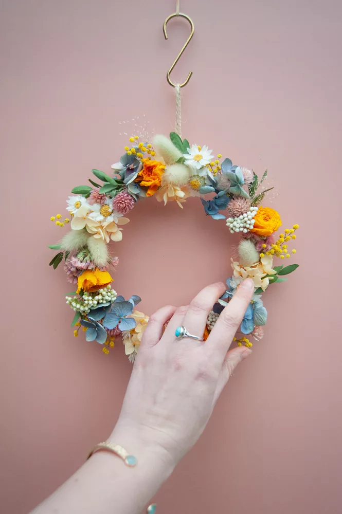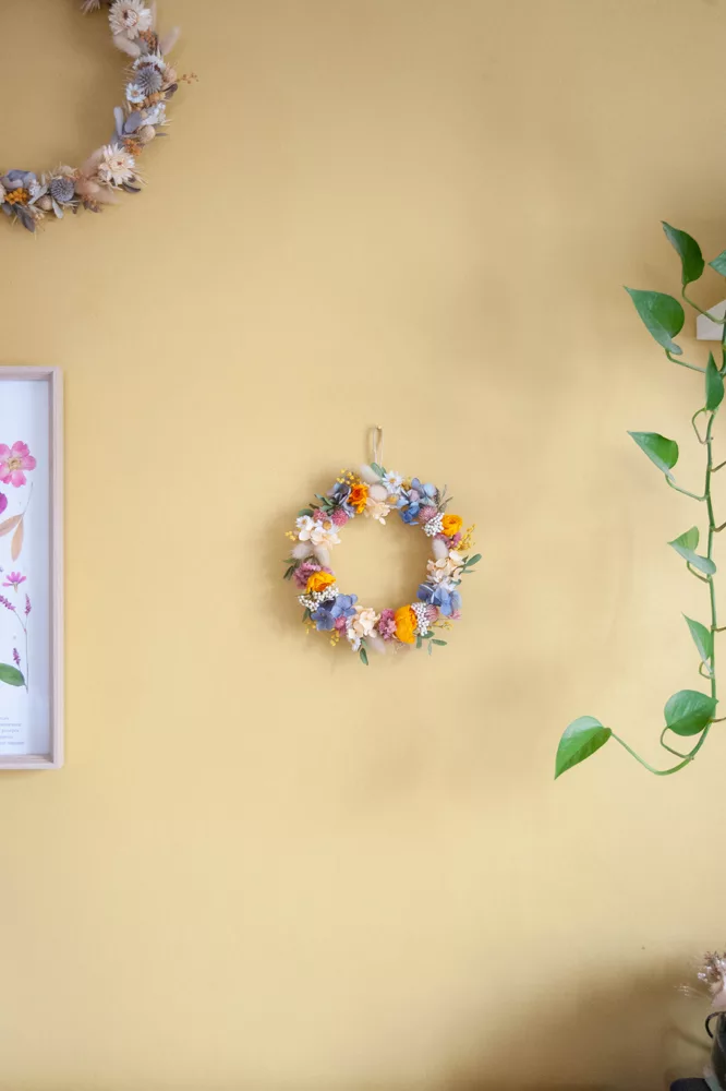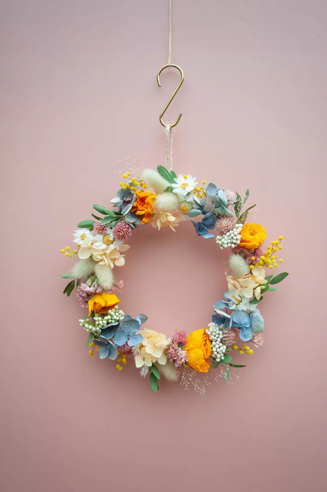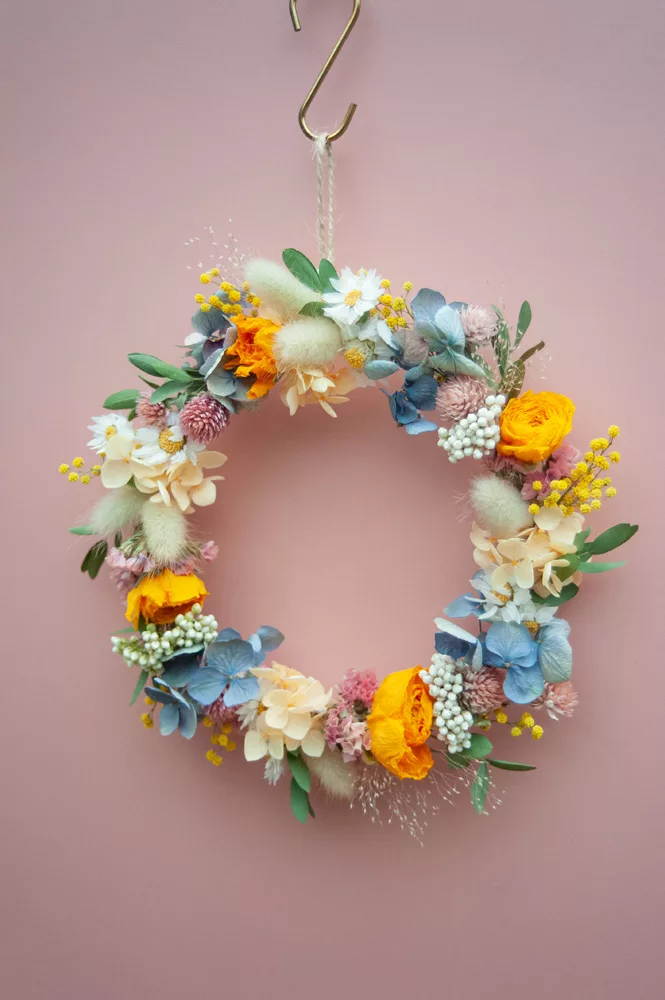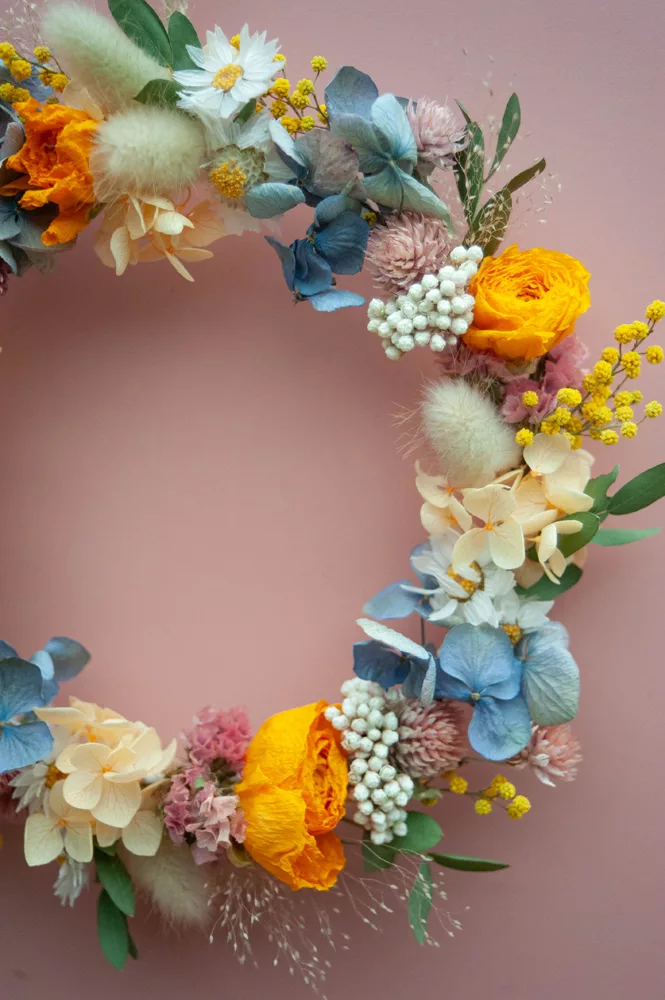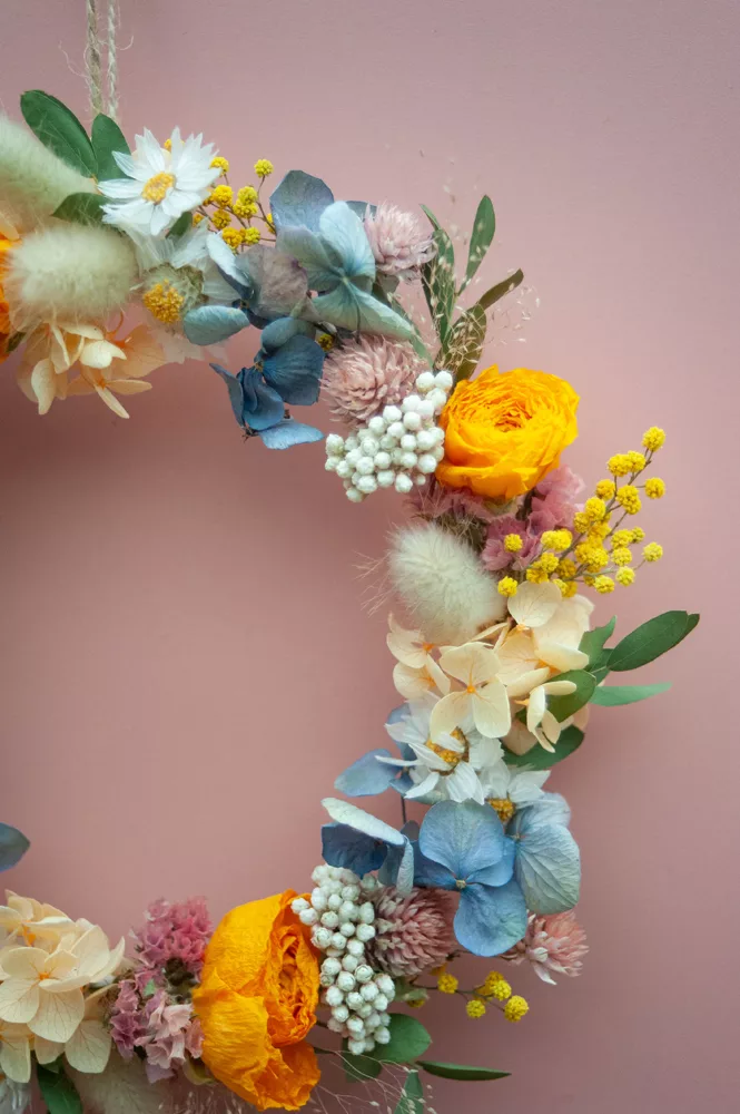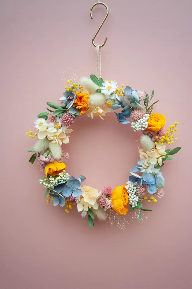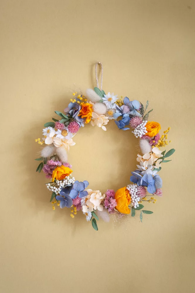Les avantages des fleurs séchées : Fini les bouquets qui fanent en quelques jours ! Les couronnes en fleurs séchées durent plusieurs mois, voire plusieurs années. Une alternative durable à la fleur fraîche, qui vous permet de profiter longtemps de la beauté florale sans gaspillage.