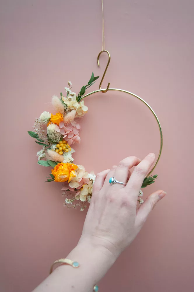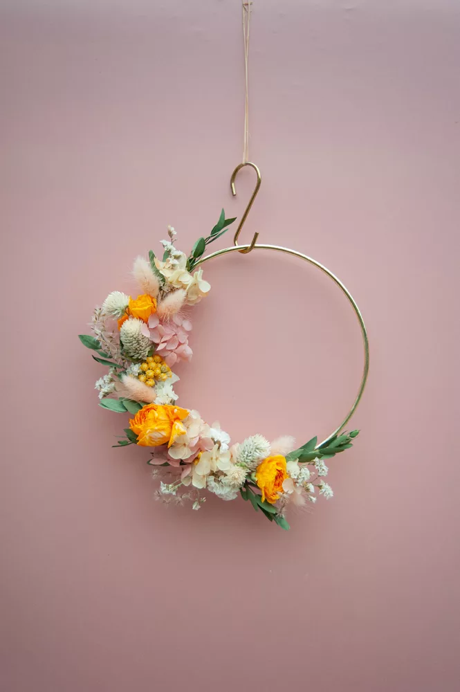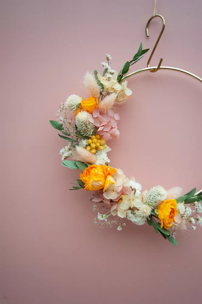Les avantages des fleurs séchées : Fini les bouquets qui fanent en quelques jours ! Les couronnes en fleurs séchées durent plusieurs mois, voire plusieurs années. Une alternative durable à la fleur fraîche, qui vous permet de profiter longtemps de la beauté florale sans gaspillage.