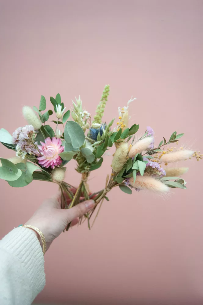 Comment les fleurs sont-elles séchées ? Une fois la récolte effectuée pendant l’été, elles vont passer plusieurs semaines la tête en bas à l’abri du soleil. Cette technique de séchage permet de garder tout l’éclat de la fleur pendant plusieurs mois. Le respect de la nature est au cœur de ma démarche c’est pour cela que jusqu’à 80 % de mes fleurs viennent de producteurs français !